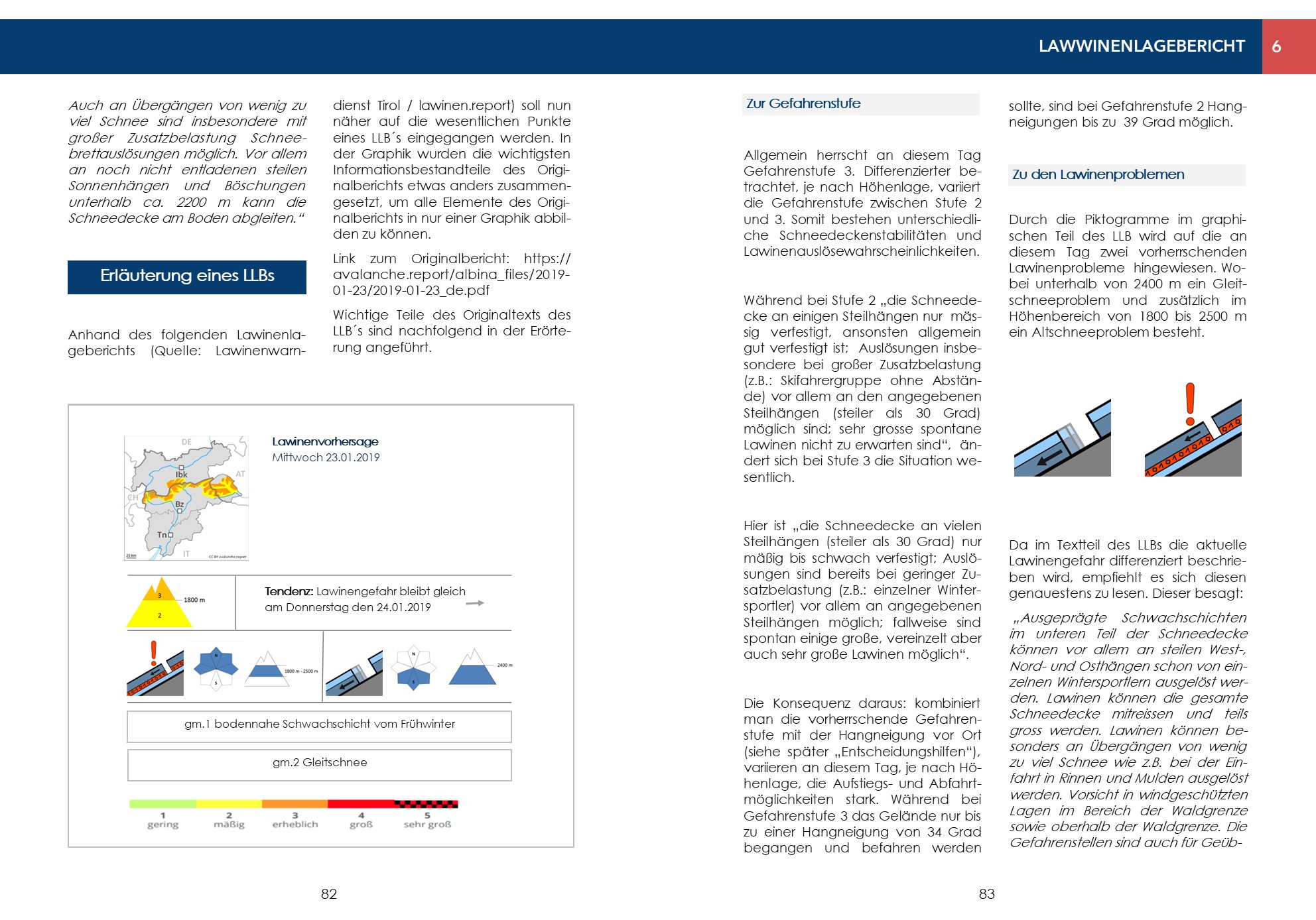 | Schlagworte | Freeride • Lawinenarten • Lawinenkunde • Notfall Lawine • Reduktionsmethoden • Risikomanagement • Schneeanalyse • Schneedecke • Schneeprofil • Skitour • Stabilitätstest |