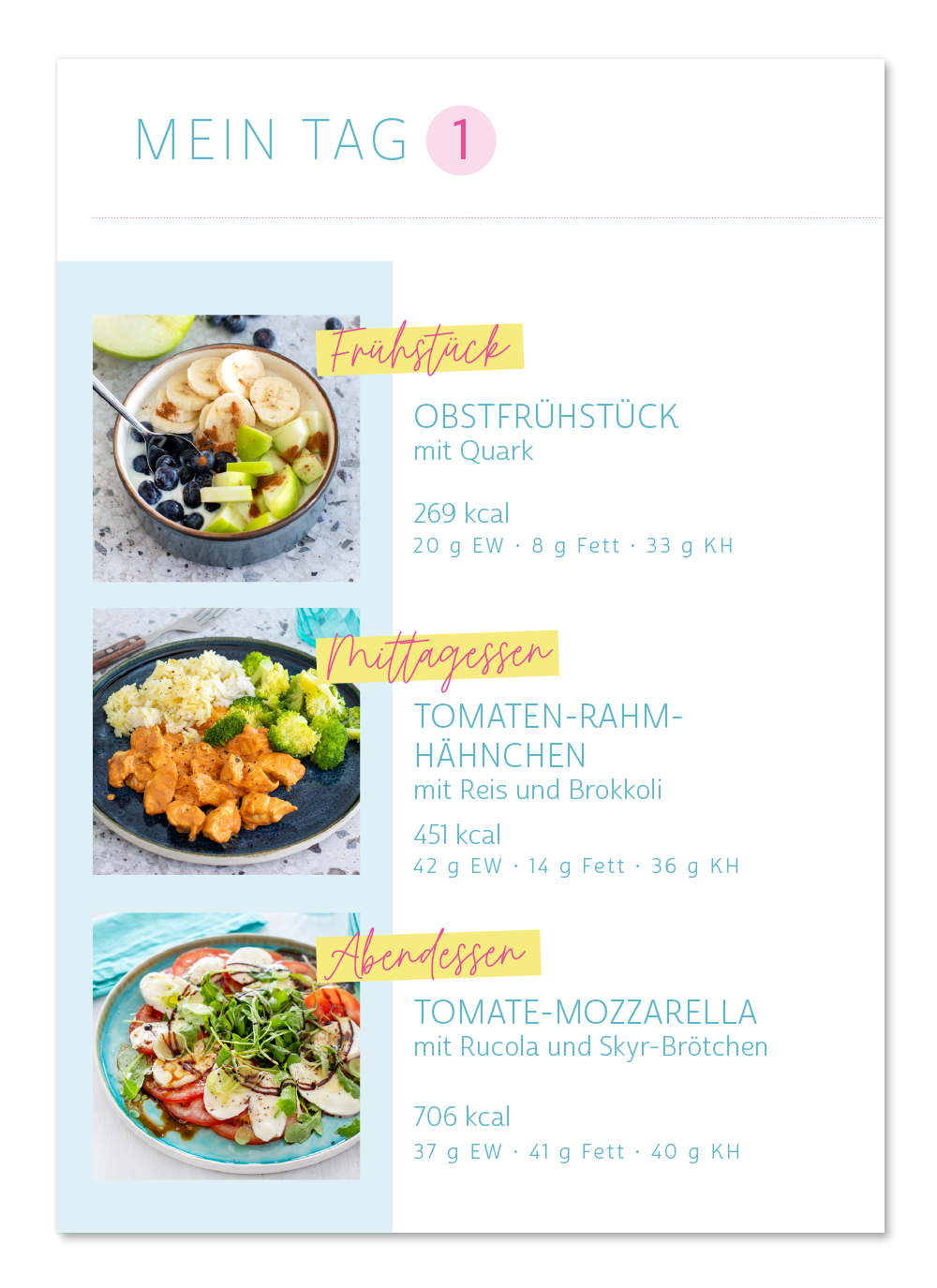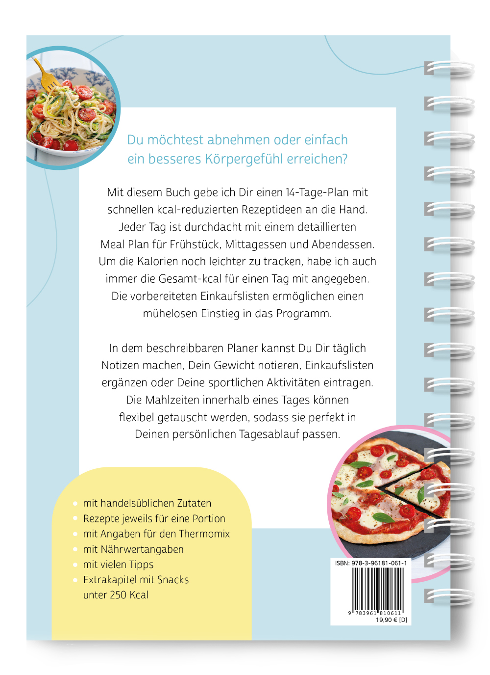 Es ist Zeit für VERÄNDERUNG, also fang an!Starte jetzt mit meinem 14-Tage-PlanMit diesem 14-Tage-Planer möchte ich Dir einen Einstieg in eine ausgewogene, proteinreiche Ernährung geben, mit der Du in 14 Tagen 2-3 Kilo abnehmen kannst.Wieso proteinreich?Eine proteinreiche Ernährung unterstützt das Immunsystem, hilft beim Muskelaufbau, beschleunigt den Stoffwechsel und die Fettverbrennung. Durch eine eiweißreiche Ernährung, bei der man zugleich auch den Anteil an Kohlenhydraten reduziert, wird der Körper dazu gezwungen, überschüssiges Fett abzubauen. Ein weiterer Vorteil ist, dass eine proteinreiche Ernährung den Blutzuckerspiegel stabil hält und so Heißhungerattacken vorbeugt.Wichtig: Ausreichend trinken! Denn die Stoffwechselprodukte aus Proteinen scheidet der Körper über die Nieren/Urin aus. Man benötigt deshalb ausreichend Flüssigkeit (Wasser, ungesüßte Tees), damit die Nieren gut funktionieren. Erwachsene sollten mindestens 1,5 bis 2 Liter trinken, um einem Wassermangel vorzubeugen.Auf den nächsten Seiten findest Du alle Infos zum Start, Einkaufslisten sowie tägliche Rezepte. Solltest Du viel Sport treiben oder einen höheren kcal-Verbrauch haben, findest Du im hinteren Teil des Planers noch kleine Snacks, um Deinen Bedarf zu decken. Also... Los geht´s!