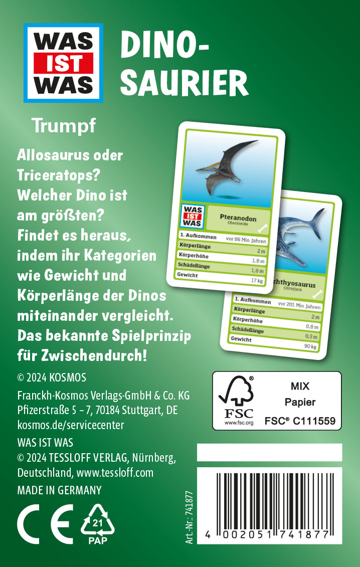 Tyrannosaurus Rex gegen Stegosaurus - im wahren Leben haben sich diese beiden Dinos nie getroffen, da sie zu unterschiedlichen Zeiten lebten. Im WAS-IST-WAS-Trumpfspiel Dinosaurier können die Spieler ihre Lieblingsdinos gegeneinander auftrumpfen und dabei noch allerlei über die Giganten der Urzeit lernen. 32 bebilderte Karten zeigen neben den bekannten Dinosauriern wie T-Rex, Triceratops oder Brachiosaurus auch weniger bekannte Dinosaurier, Flugsaurier und Meeressaurier. Die Spieler erfahren Gewicht, Größe, Vorkommen und Nahrung der Urzeitgiganten und bekommen beim Trumpfen ein Gefühl dafür, wie groß oder schwer diese Riesen wirklich waren. © Tessloff Verlag Nürnberg. Alle Rechte vorbehalten.
