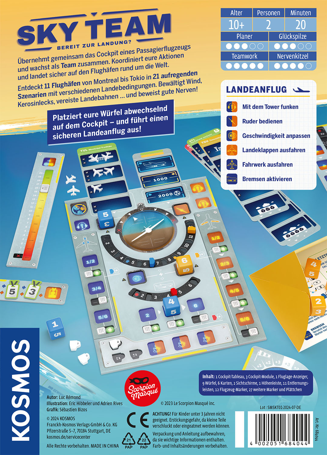 Bereit zur Landung? In dem kooperativen Spiel schlüpft ihr zu zweit in die Rollen einer Pilotin und eines Co-Piloten, die gemeinsam ein Flugzeug steuern. Ziel ist es, das Flugzeug sicher auf verschiedenen Flughäfen weltweit zu landen. Dafür müsst ihr eure Würfel geschickt den richtigen Feldern im Cockpit zuordnen, um das Flugzeug auszubalancieren, die Geschwindigkeit zu kontrollieren, die Landeklappen und das Fahrwerk auszufahren und den Tower zu kontaktieren. Stellt sicher, dass der Flugraum auch tatsächlich frei ist und vor allem: Verfehlt ja nicht die Landebahn! Von Montreal bis Tokio - jeder Flughafen hat seine eigenen Landebedingungen. Beweist euer Können als eingespieltes Team am Steuer des Jumbo-Jets. Seid ihr bereit für den Nervenkitzel? Dann erlebt Sky Team - das ultimative Spiel für angehende Piloten und Pilotinnen ab 10 Jahren. Ausgezeichnet als "Spiel des Jahres" 2024.