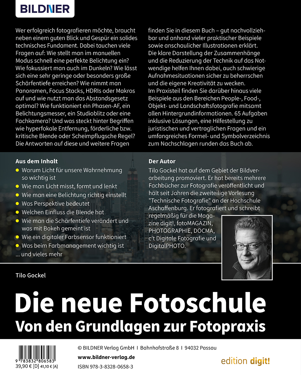 Wer erfolgreich fotografieren möchte, braucht neben einem guten Blick und Gespür ein solides technisches Fundament. Dabei tauchen viele Fragen auf: Wie stellt man im manuellen Modus schnell eine perfekte Belichtung ein? Wie fokussiert man auch im Dunkeln? Wie lässt sich eine sehr geringe oder besonders große Schärfentiefe erreichen? Wie nimmt man Panoramen, Focus Stacks, HDRIs oder Makros auf und wie nutzt man das Abstandsgesetz optimal? Wie funktioniert ein Phasen-AF, ein Belichtungsmesser, ein Studioblitz oder eine Fachkamera? Und was steckt hinter Begriffen wie hyperfokale Entfernung, förderliche bzw. kritische Blende oder Scheimpflugsche Regel? Die Antworten auf diese und weitere Fragen finden Sie in diesem Buch – gut nachvollziehbar und anhand vieler praktischer Beispiele sowie anschaulicher Illustrationen erklärt. Die klare Darstellung der Zusammenhänge und die Reduzierung der Technik auf das Notwendige helfen Ihnen dabei, auch schwierige Aufnahmesituationen sicher zu beherrschen und die eigene Kreativität zu wecken.Im Praxisteil finden Sie darüber hinaus viele Beispiele aus den Bereichen People-, Food-, Objekt- und Landschaftsfotografie mitsamt allen Hintergrundinformationen. 65 Aufgaben inklusive Lösungen, eine Hilfestellung zu juristischen und vertraglichen Fragen und ein umfangreiches Formel- und Symbolverzeichnis zum Nachschlagen runden das Buch ab.