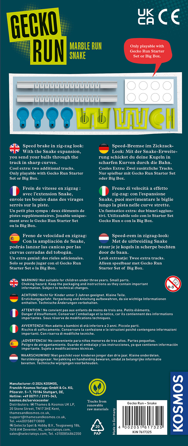 Wie gut schlängelt sich die Kugel durch den Zick-Zack-Kurs? Mit der Snake-Erweiterung bekommt die Gecko Run Kugelbahn ein neues, spannendes Trick-Element dazu! Schafft es die Kugel sicher wieder heraus? Und wie wirkt sich der plötzliche Tempowechsel aus? Spannende neue Fragen, die die Kinder ab acht Jahren austüfteln können! Die Anleitung gibt den ersten Kick mit Ideen für die Tricks. Das tolle Extra: Zusätzliche Bahn-Elemente vergrößern die Reichweite der KOSMOS Kugelbahn! Hinweis: nur mit dem Gecko Run „Starter Set“ oder der „Big Box“ spielbar.