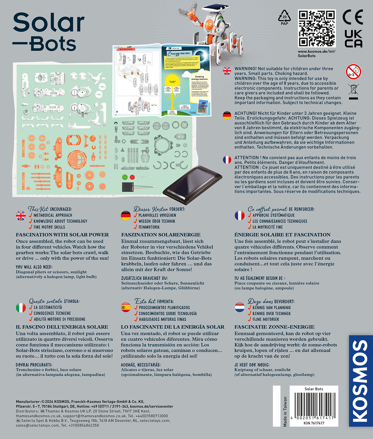 Dieses kleine Energiebündel rollt, krabbelt, fährt oder läuft mit der Kraft der Sonne! Einmal zusammengebaut, lässt sich der Solar Bot von KOSMOS auf vier verschiedene Untersätze klicken und kann sich so auf ganz unterschiedliche Arten fortbewegen. Und das alles ohne Batterien, denn ein Solarpanel und ein Getriebe sorgen dafür, dass die Energie der Sonne genutzt und in eine Bewegung umgewandelt wird.