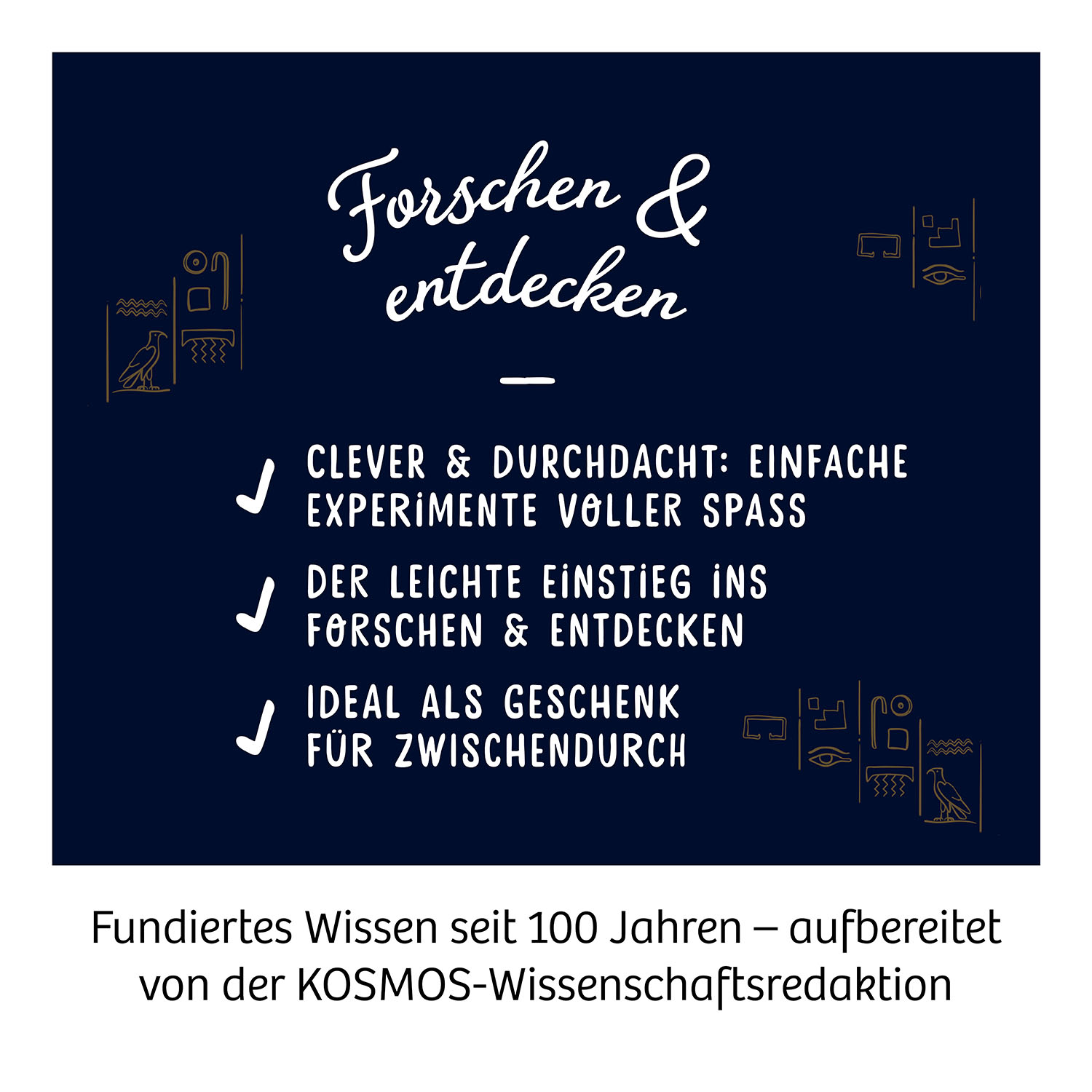 Sandige Winde haben die Schätze des Pharaos unter sich begraben. Jetzt werden mutige Archäologen und Archäologinnen gebraucht, die sich mit Hammer und Meißel an die Ausgrabung wagen. Doch was bedeuten diese eigenartigen Zeichen auf dem Gipsblock? Mit dem Hieroglyphen-Alphabet in der farbig illustrierten Anleitung entziffern die Kinder das große Rätsel, wessen Grabstätte sie gerade entdecken. Schicht für Schicht legen sie die Grabbeigaben frei: Edelsteine, Kanopen mit tierischen Köpfen und sogar einen glänzenden Sarkophag! Mit der Anleitung tauchen sie tiefer in die Geschichte der Pharaonen ein, finden heraus, was es mit der Mumifizierung auf sich hat, und wie sich in Ägypten diese faszinierende, antike Hochkultur entwickeln konnte. Mit dem KOSMOS Ausgrabungs-Set geht es auf Reisen in ein weit entferntes Land!