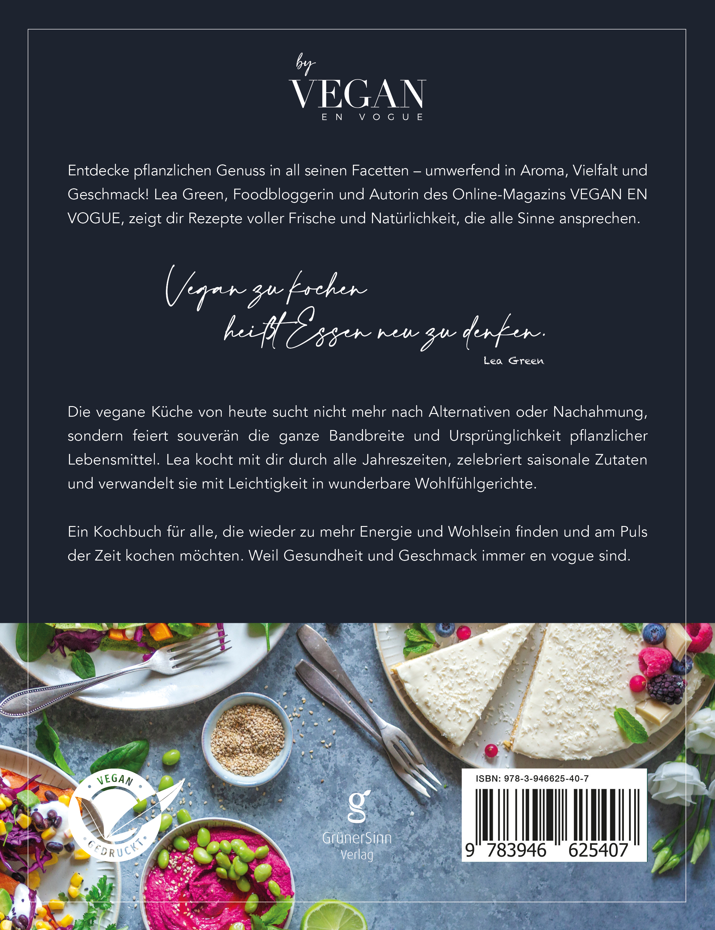 Vegan kochen – Essen neu denken“ ist das dritte Kochbuch der veganen Profiköchin und Foodbloggerin Lea Green. Sie selbst lebt seit 2012 rein vegan und veröffentlicht seit 2013 auf ihrem Foodblog VEGGIES regelmäßig vegane Rezepte und Küchentricks. Hier und auf Instagram zeigt Lea ihren Lesern und Followern, wie vielfältig, bunt und unkompliziert die saisonale vegane Küche ist. Darüber hinaus ist sie regelmäßig auf Messen und Kochshows in ganz Deutschland zu sehen. Lea liebt das Kochen im Einklang mit den Jahreszeiten und die Transformation naturbelassener Lebensmittel in immer neue, spannende Gerichte. Ihre Rezepte sind stets einfach, gelingsicher und ohne künstliche Ersatzprodukte.
