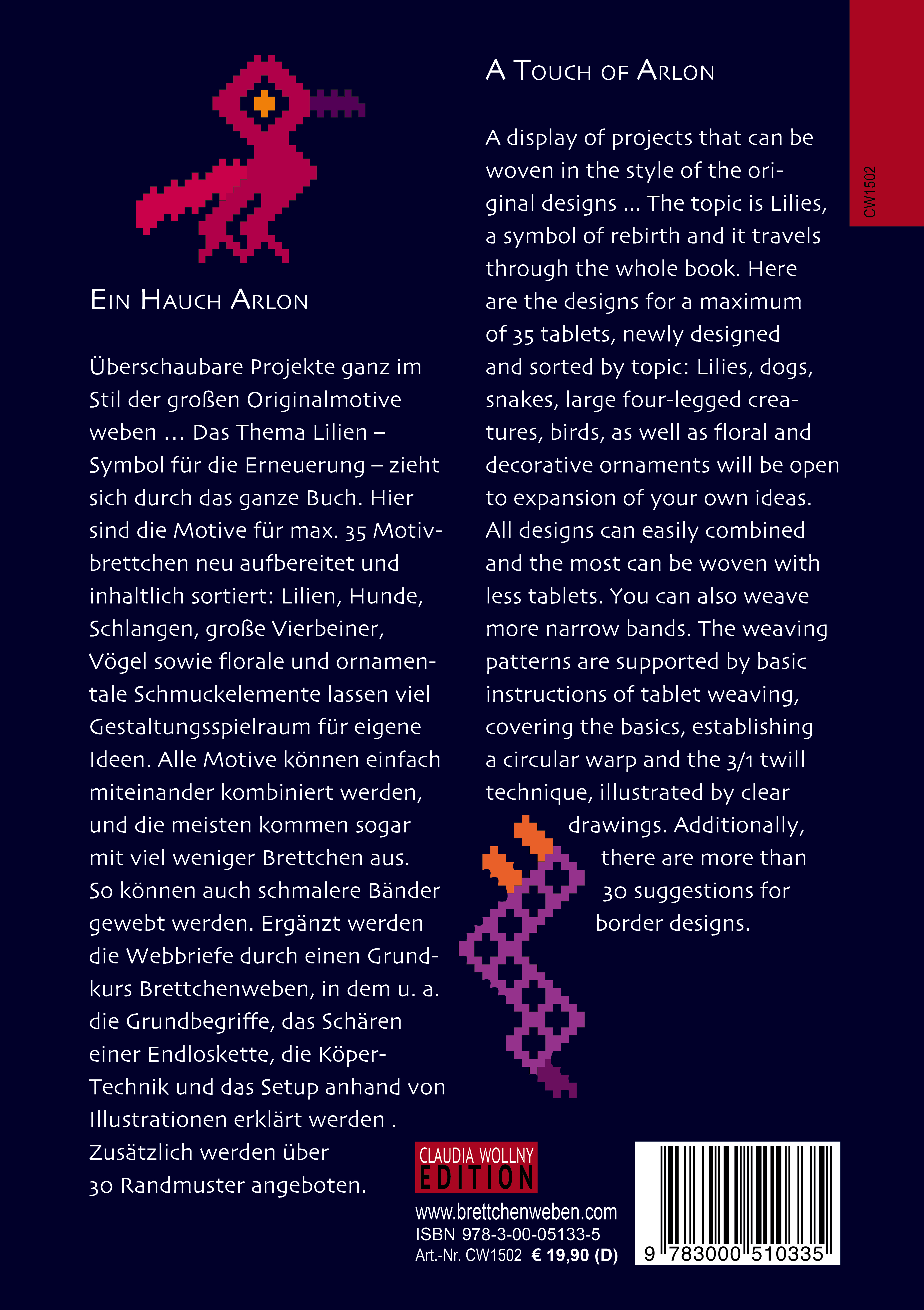 Ein Hauch Arlon: Überschaubare Projekte ganz im Stil der großen Originalmotive weben … Das Thema Lilien – Symbol für die Erneuerung – zieht sich durch das ganze Buch. Hier sind die Motive für max. 35 Motivbrettchen neu aufbereitet und inhaltlich sortiert: Lilien, Hunde, Schlangen, große Vierbeiner, Vögel sowie florale und ornamentale Schmuckelemente lassen viel Gestaltungsspielraum für eigene Ideen. Alle Motive können einfach miteinander kombiniert werden, und die meisten kommen sogar mit viel weniger Brettchen aus. So können auch schmalere Bänder gewebt werden. Ergänzt werden die Webbriefe durch einen Grundkurs Brettchenweben, in dem u. a. die Grundbegriffe, das Schären einer Endloskette, die Köper-Technik und das Setup anhand von Illustrationen erklärt werden. Zusätzlich werden über 30 Randmuster angeboten.