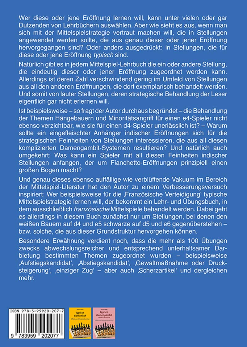 Wer diese oder jene Eröffnung lernen will, kann unter vielen oder gar Dutzenden von Lehrbüchern auswählen. Aber wie sieht es aus, wenn man sich mit der Mittelspielstrategie vertraut machen will, die in Stellungen angewendet werden sollte, die aus genau dieser oder jener Eröffnung hervorgegangen sind? Oder anders ausgedrückt: in Stellungen, die für diese oder jene Eröffnung typisch sind.Natürlich gibt es in jedem Mittelspiel-Lehrbuch die ein oder andere Stellung, die eindeutig dieser oder jener Eröffnung zugeordnet werden kann. Allerdings ist deren Zahl verschwindend gering im Umfeld von Stellungen aus all den anderen Eröffnungen, die dort exemplarisch behandelt werden. Und somit von lauter Stellungen, deren strategische Behandlung der Leser eigentlich gar nicht erlernen will.Ist beispielsweise - so fragt der Autor durchaus begründet - die Behandlung der Themen Hängebauern und Minoritätsangriff für einen e4-Spieler nicht ebenso verzichtbar, wie sie für einen d4-Spieler unerlässlich ist? - Warum sollte ein eingefleischter Anhänger indischer Eröffnungen sich für die strategischen Feinheiten von Stellungen interessieren, die aus all diesen komplizierten Damengambit-Systemen resultieren? Und natürlich auch umgekehrt: Was kann ein Spieler mit all diesen Feinheiten indischer Stellungen anfangen, der um Fianchetto-Eröffnungen prinzipiell einen großen Bogen macht?Und genau dieses ebenso auffällige wie verblüffende Vakuum im Bereich der Mittelspiel-Literatur hat den Autor zu einem Verbesserungsversuch inspiriert: Wer beispielsweise für die 'Französische Verteidigung' typische Mittelspielstrategie lernen will, der bekommt ein Lehr- und Übungsbuch, in dem ausschließlich französische Mittelspiele behandelt werden. Dabei geht es allerdings in diesem Buch zunächst nur um Stellungen, bei denen den weißen Bauern auf d4 und e5 schwarze auf d5 und e6 gegenüberstehen - bzw. solche, die aus dieser Grundstruktur hervorgehen können.Besondere Erwähnung verdient noch, dass die mehr als 100 Übungen zwecks abwechslungsreicher und entsprechend unterhaltsamer Darbietung bestimmten Themen zugeordnet wurden - beispielsweise 'Aufstiegskandidat', 'Abstiegskandidat', 'Gewaltmaßnahme oder Drucksteigerung', 'einziger Zug' - aber auch 'Scherzartikel' und dergleichen mehr.