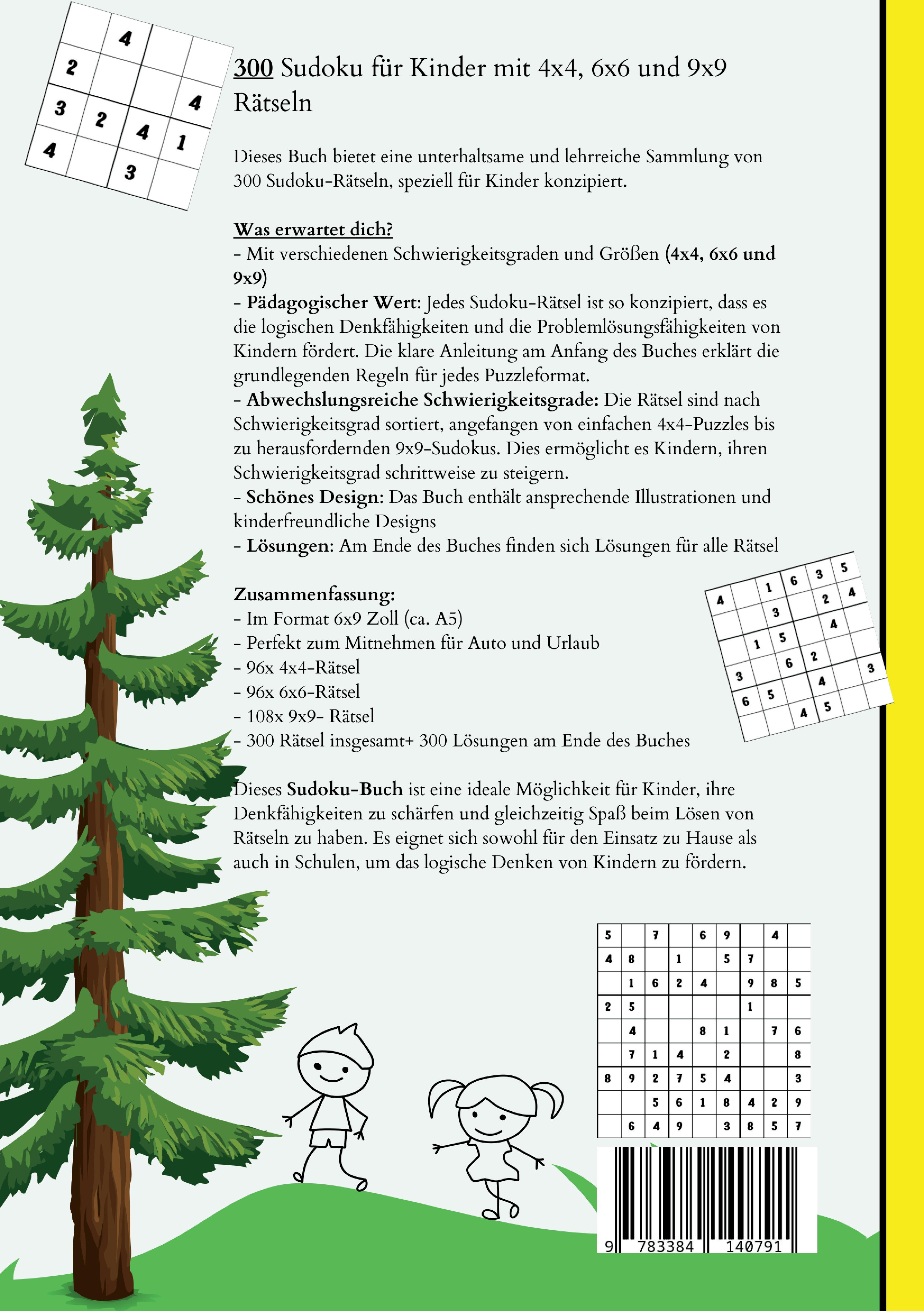 300 Sudoku für Kinder mit 4x4, 6x6 und 9x9 RätselnDieses Buch bietet eine unterhaltsame und lehrreiche Sammlung von 300 Sudoku-Rätseln, speziell für Kinder konzipiert. Was erwartet dich?- Mit verschiedenen Schwierigkeitsgraden und Größen (4x4, 6x6 und 9x9) - Pädagogischer Wert: Jedes Sudoku-Rätsel ist so konzipiert, dass es die logischen Denkfähigkeiten und die Problemlösungsfähigkeiten von Kindern fördert. Die klare Anleitung am Anfang des Buches erklärt die grundlegenden Regeln für jedes Puzzleformat.- Abwechslungsreiche Schwierigkeitsgrade: Die Rätsel sind nach Schwierigkeitsgrad sortiert, angefangen von einfachen 4x4-Puzzles bis zu herausfordernden 9x9-Sudokus. Dies ermöglicht es Kindern, ihren Schwierigkeitsgrad schrittweise zu steigern.- Schönes Design: Das Buch enthält ansprechende Illustrationen und kinderfreundliche Designs- Lösungen: Am Ende des Buches finden sich Lösungen für alle Rätsel...Zusammenfassung:- Im Format A5- Perfekt zum Mitnehmen für Auto und Urlaub- 96x 4x4-Rätsel- 96x 6x6-Rätsel- 108x 9x9- Rätsel- 300 Rätsel insgesamt+ 300 Lösungen am Ende des BuchesDieses Sudoku-Buch ist eine ideale Möglichkeit für Kinder, ihre Denkfähigkeiten zu schärfen und gleichzeitig Spaß beim Lösen von Rätseln zu haben. Es eignet sich sowohl für den Einsatz zu Hause als auch in Schulen, um das logische Denken von Kindern zu fördern.