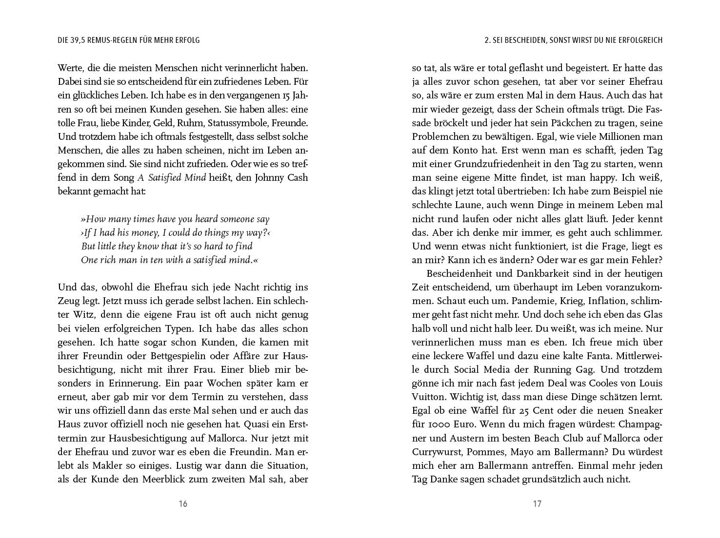 Marcel Remus ist nicht nur einer der bekanntesten Luxusmakler in Europa, sondern auch einer der erfolgreichsten. Allein im vergangenen Jahr konnte er Immobilien für über 130 Millionen Euro verkaufen. Und das auf der Deutschen liebsten Ferieninsel Mallorca. Zu seinen Kunden zählen Millionäre, Milliardäre und Hollywoodstars. Früher wurde er belächelt, heute wird er mehrfach kopiert. Sein Ziel: mit 40 in Rente. Und mit einem eigenen Immobilienvermögen von über 35 Millionen ist er auf dem besten Weg dahin. Aber wie wird man so erfolgreich, europaweit bekannt und verliert trotzdem nicht die Bodenhaftung?Nach seinem ersten Buch Alles anders als alle anderen: Mein Erfolgsgeheimnis - und wie auch du es schaffen kannst folgt nun sein zweites Werk, in dem er seine 39,5 Erfolgsregeln verrät, die ihn zum Immobilien-Superstar und Multimillionär machten. Die Leser erhalten spannende Einblicke in sein Leben und die Welt der VIPs auf Mallorca: Warum ein vermeintliches Date mit Madonnas Tochter zu einem Rieseneklat mit dem Popstar führte, welche weisen Worte Weltstar Sir Elton John ihm mit auf den Weg gab, wie er am Anfang seiner Karriere fast in die Pleite geriet, wie er sein Leben nach Problemen mit seinem Herzen komplett auf den Kopf stellte und warum ihm sein »erstes Mal« heute peinlich ist. Auch über die Schattenseiten von Glanz und Glamour spricht er offen wie nie. Aus den 39,5 Erfolgsregeln lassen sich jede Menge Tipps und Tricks für den eigenen Weg ableiten.