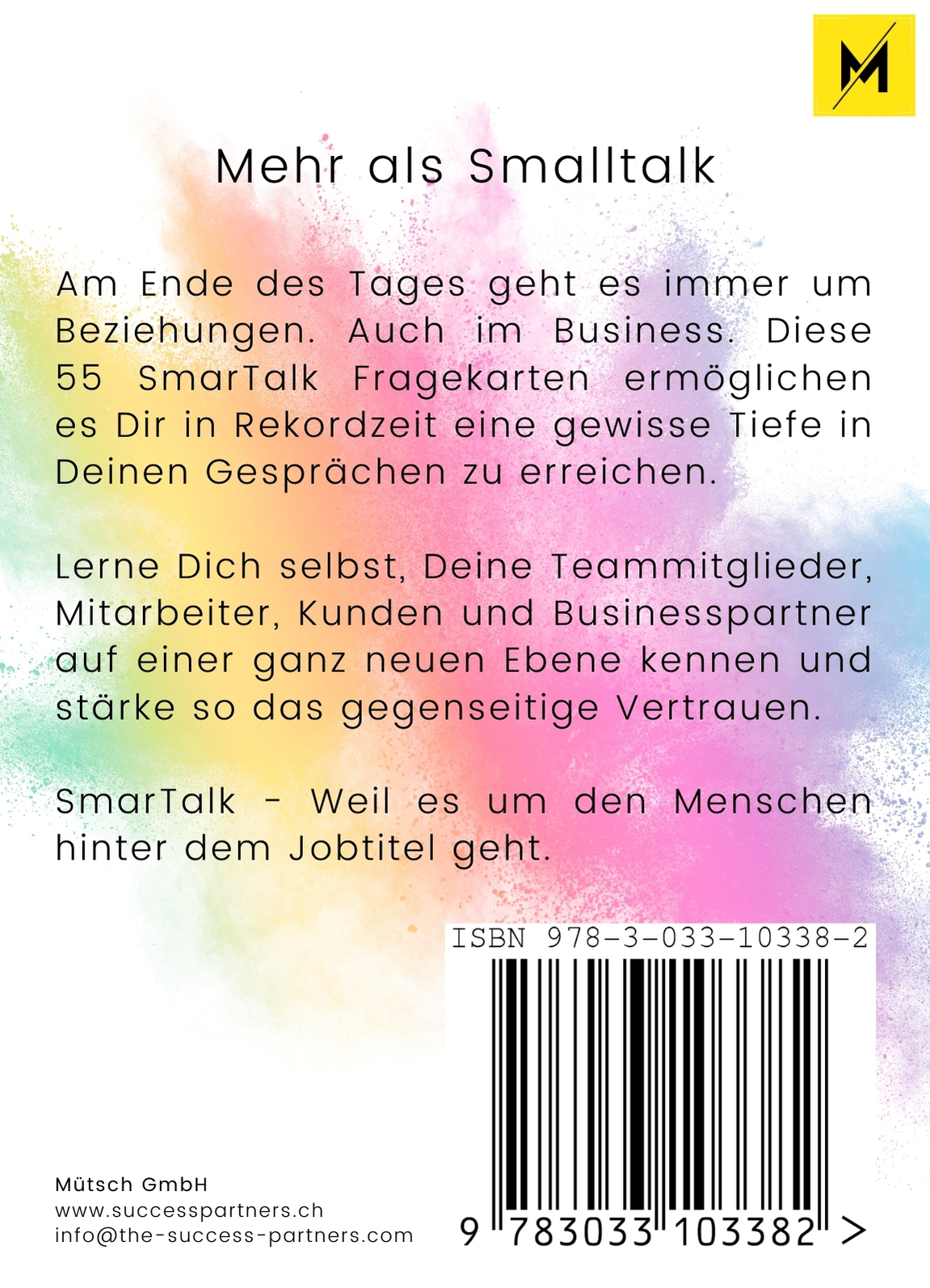 Diese 55 SmarTalk Fragekarten ermöglichen es Dir in Rekordzeit eine gewisse Tiefe in Deinen Gesprächen zu erreichen. Lerne Dich selbst und andere auf einer ganz neuen Ebene kennen und stärke so das gegenseitige Vertrauen. Das SmarTalk Set enthält c.a. 25 berufsbezogene Fragen, weshalb es auch sehr gut für den Austausch im beruflichen Kontext, z. B. beim Onboarding, in Teammeetings oder im Rekrutierungsprozess geeignet ist.