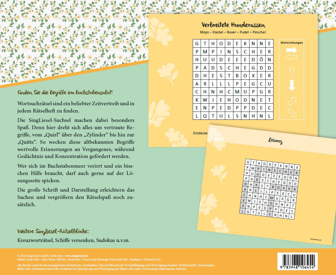 Finden Sie die vertrauten Begriffe im Buchstabensalat!Wortsuchrätsel sind ein beliebter Zeitvertreib und in jedem Rätselheft zu finden.Die SingLiesel-Suchsel machen dabei besonders Spaß. Denn hier dreht sich alles um vertraute Begriffe, vom "Quirl" über den "Zylinder" bis hin zur "Quitte". So wecken diese altbekannten Begriffe wertvolle Erinnerungen an Vergangenes, während Gedächtnis und Konzentration gefördert werden.Wer sich im Buchstabenmeer verirrt und ein bisschen Hilfe braucht, darf auch gerne auf der Lösungsseite spicken.Die große Schrift und Darstellung erleichtern das Suchen und vergrößern den Rätselspaß noch zusätzlich.Weitere SingLiesel-Rätselblöcke: Kreuzworträtsel, Schiffe versenken, Sudokus u.v.m.