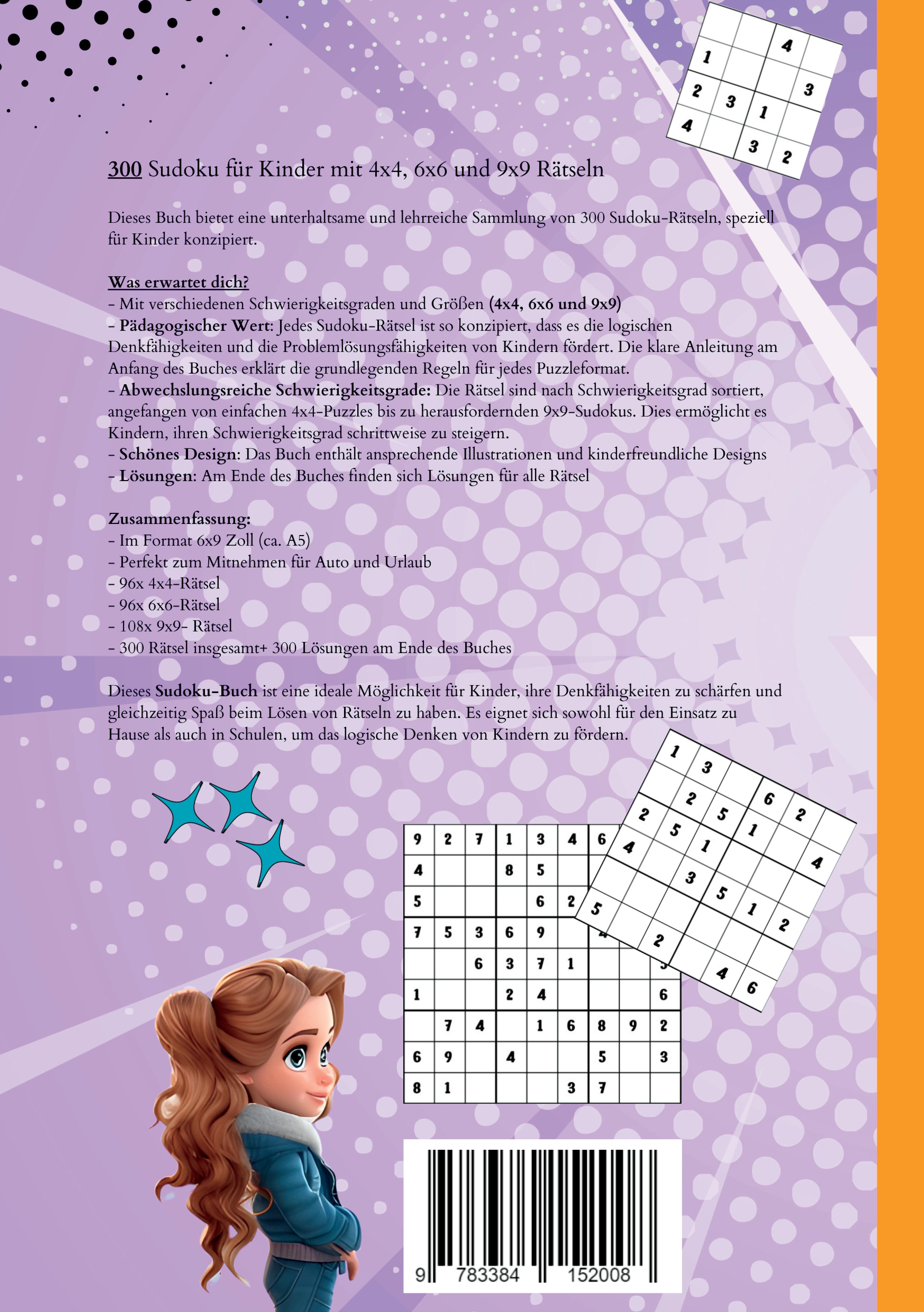 300 Sudoku für Kinder mit 4x4, 6x6 und 9x9 Rätseln.Dieses Buch bietet eine unterhaltsame und lehrreiche Sammlung von 300 Sudoku-Rätseln, speziell für Kinder konzipiert. Was erwartet dich?- Mit verschiedenen Schwierigkeitsgraden und Größen (4x4, 6x6 und 9x9) - Pädagogischer Wert: Jedes Sudoku-Rätsel ist so konzipiert, dass es die logischen Denkfähigkeiten und die Problemlösungsfähigkeiten von Kindern fördert. Die klare Anleitung am Anfang des Buches erklärt die grundlegenden Regeln für jedes Puzzleformat.- Abwechslungsreiche Schwierigkeitsgrade: Die Rätsel sind nach Schwierigkeitsgrad sortiert, angefangen von einfachen 4x4-Puzzles bis zu herausfordernden 9x9-Sudokus. Dies ermöglicht es Kindern, ihren Schwierigkeitsgrad schrittweise zu steigern.- Schönes Design: Das Buch enthält ansprechende Illustrationen und kinderfreundliche Designs- Lösungen: Am Ende des Buches finden sich Lösungen für alle Rätsel..Zusammenfassung:- Im Format A5- Perfekt zum Mitnehmen für Auto und Urlaub- 96x 4x4-Rätsel- 96x 6x6-Rätsel- 108x 9x9- Rätsel- 300 Rätsel insgesamt+ 300 Lösungen am Ende des Buches...Dieses Sudoku-Buch ist eine ideale Möglichkeit für Kinder, ihre Denkfähigkeiten zu schärfen und gleichzeitig Spaß beim Lösen von Rätseln zu haben. Es eignet sich sowohl für den Einsatz zu Hause als auch in Schulen, um das logische Denken von Kindern zu fördern.