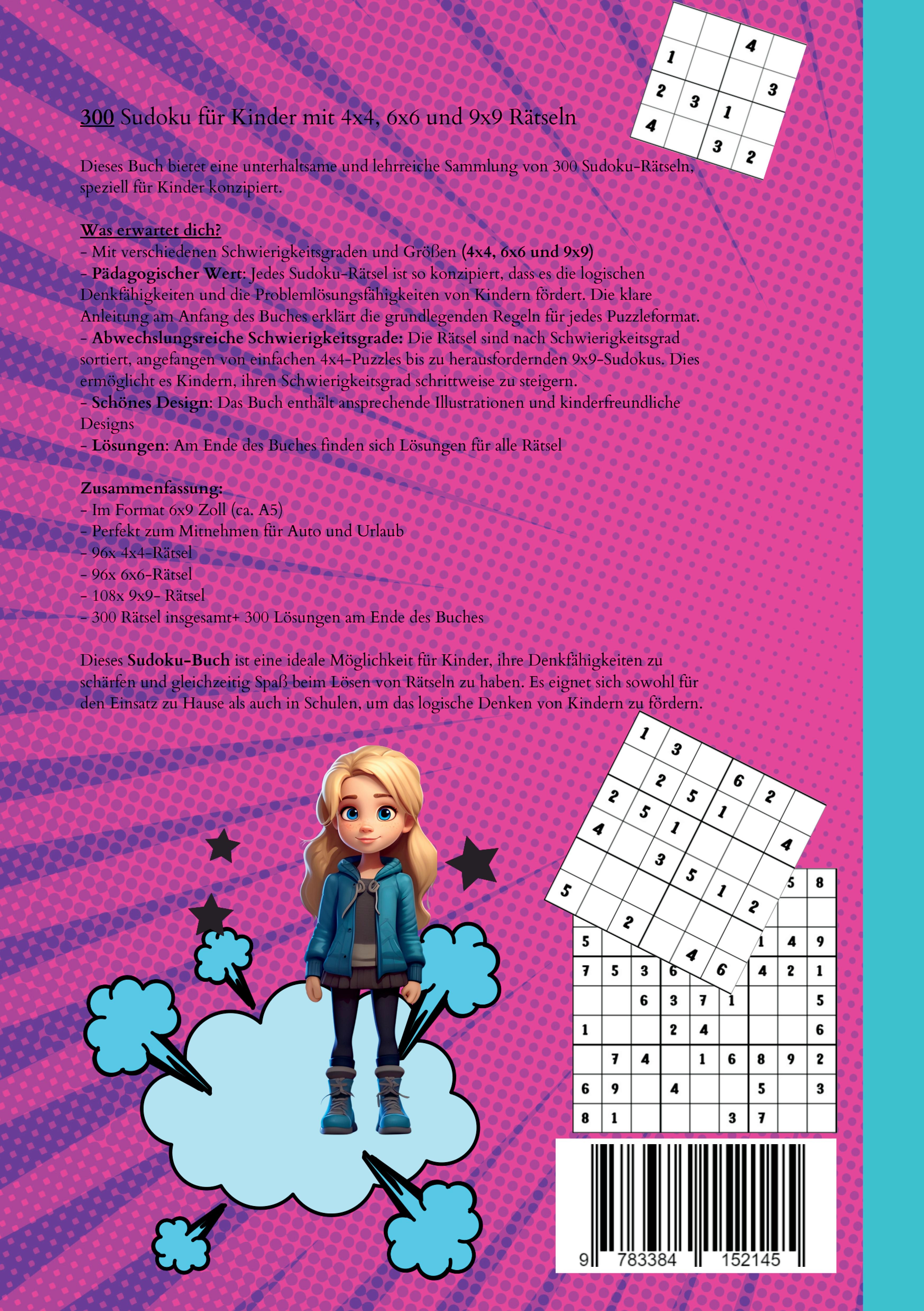 300 Sudoku für Kinder mit 4x4, 6x6 und 9x9 Rätseln.Dieses Buch bietet eine unterhaltsame und lehrreiche Sammlung von 300 Sudoku-Rätseln, speziell für Kinder konzipiert. Was erwartet dich?- Mit verschiedenen Schwierigkeitsgraden und Größen (4x4, 6x6 und 9x9) - Pädagogischer Wert: Jedes Sudoku-Rätsel ist so konzipiert, dass es die logischen Denkfähigkeiten und die Problemlösungsfähigkeiten von Kindern fördert. Die klare Anleitung am Anfang des Buches erklärt die grundlegenden Regeln für jedes Puzzleformat.- Abwechslungsreiche Schwierigkeitsgrade: Die Rätsel sind nach Schwierigkeitsgrad sortiert, angefangen von einfachen 4x4-Puzzles bis zu herausfordernden 9x9-Sudokus. Dies ermöglicht es Kindern, ihren Schwierigkeitsgrad schrittweise zu steigern.- Schönes Design: Das Buch enthält ansprechende Illustrationen und kinderfreundliche Designs- Lösungen: Am Ende des Buches finden sich Lösungen für alle Rätsel...Zusammenfassung:- Im Format A5- Perfekt zum Mitnehmen für Auto und Urlaub- 96x 4x4-Rätsel- 96x 6x6-Rätsel- 108x 9x9- Rätsel- 300 Rätsel insgesamt+ 300 Lösungen am Ende des Buches...Dieses Sudoku-Buch ist eine ideale Möglichkeit für Kinder, ihre Denkfähigkeiten zu schärfen und gleichzeitig Spaß beim Lösen von Rätseln zu haben. Es eignet sich sowohl für den Einsatz zu Hause als auch in Schulen, um das logische Denken von Kindern zu fördern.