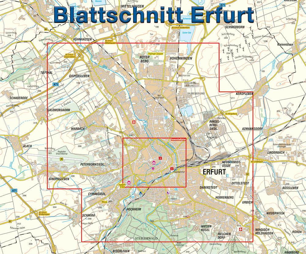 Erfurt, die Landeshauptstadt des Freistaates Thüringen, ist mit knapp 215.000 Einwohnern die größte Stadt Thüringen. Neben der Krämerbrücke stellt das einzigartige Ensemble von Dom und Severikirche eine der Hauptsehenswürdigkeiten der beliebten Stadt dar. Die mittelalterlich geprägten Altstadt mit ca. 25 Pfarrkirchen, der barocken Zitadelle Petersberg, der ältesten erhaltenen Synagoge in Mitteleuropa sowie zahlreichen Fachwerk- und anderen Bürgerhäusern zieht jedes Jahr tausende Besucher an.Der neue reiß- und wetterfeste Stadtplan Erfurt stellt im Maßstab 1:15 000 die Kernstadt von Erfurt dar. Eine Vergrößerung des Innenstadtplanes ermöglicht die schnelle Orientierung.Ein Straßenverzeichnis vervollständigt den handlichen Stadtplan.