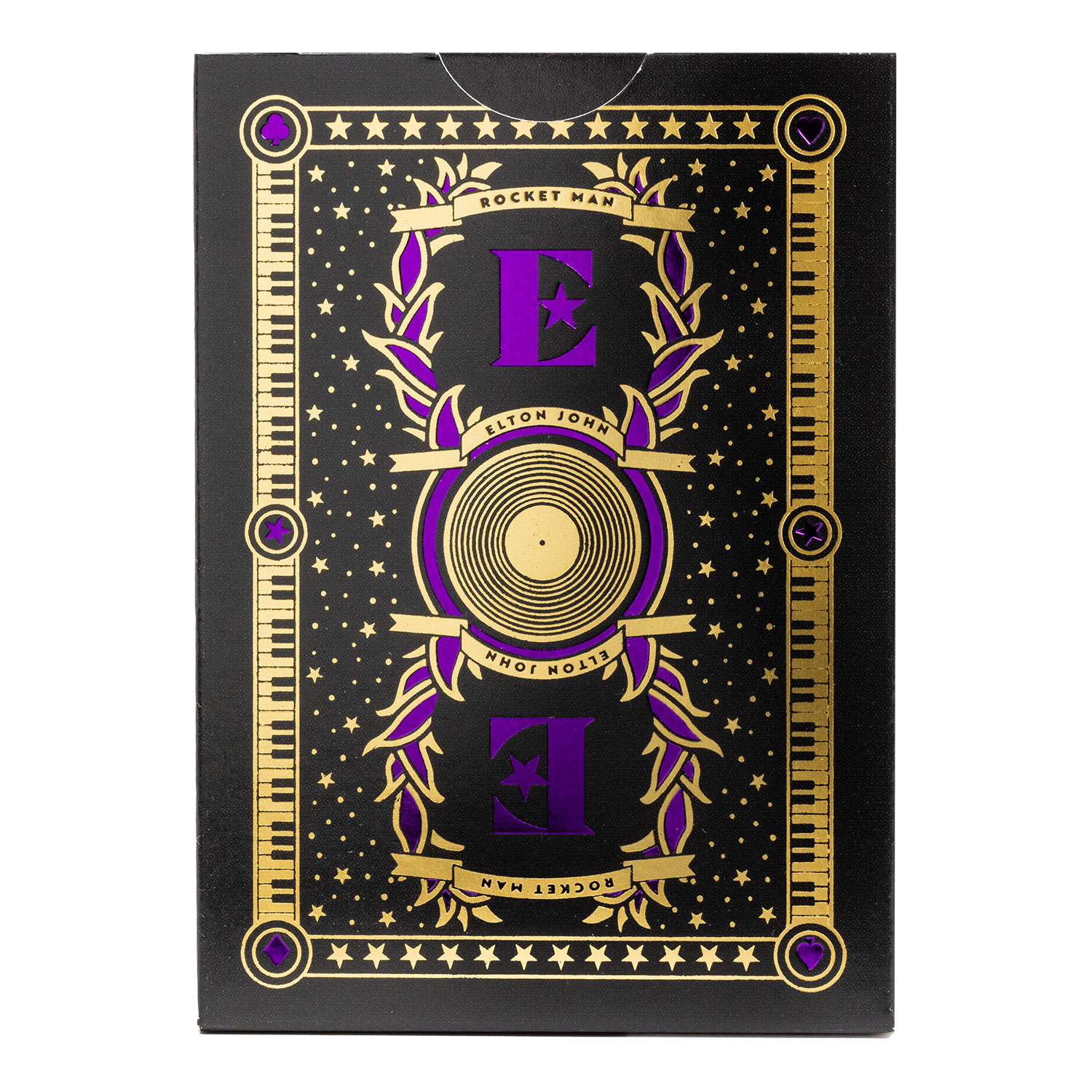 Elton John-Charaktere auf den KartenvorderseitenIndividuelle Gestaltung der KartenrückseiteGold- und lilafarbene Folienakzente auf dem Tuck CaseLuftkissen-Finish