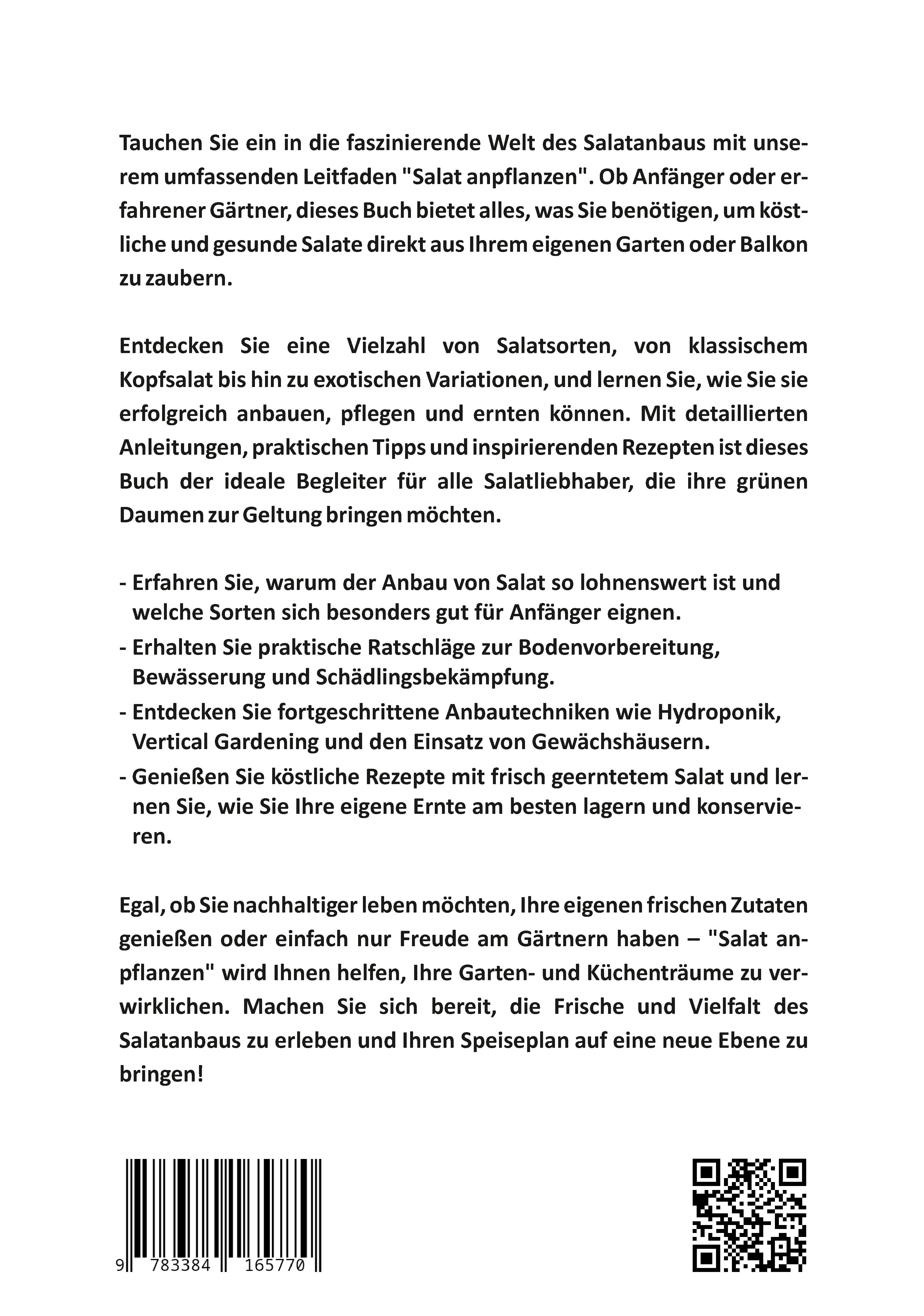 Tauchen Sie ein in die faszinierende Welt des Salatanbaus mit unserem umfassenden Leitfaden "Salat anpflanzen". Ob Anfänger oder erfahrener Gärtner, dieses Buch bietet alles, was Sie benötigen, um köstliche und gesunde Salate direkt aus Ihrem eigenen Garten oder Balkon zu zaubern.Entdecken Sie eine Vielzahl von Salatsorten, von klassischem Kopfsalat bis hin zu exotischen Variationen, und lernen Sie, wie Sie sie erfolgreich anbauen, pflegen und ernten können. Mit detaillierten Anleitungen, praktischen Tipps und inspirierenden Rezepten ist dieses Buch der ideale Begleiter für alle Salatliebhaber, die ihre grünen Daumen zur Geltung bringen möchten.- Erfahren Sie, warum der Anbau von Salat so lohnenswert ist und welche Sorten sich besonders gut für Anfänger eignen.- Erhalten Sie praktische Ratschläge zur Bodenvorbereitung, Bewässerung und Schädlingsbekämpfung.- Entdecken Sie fortgeschrittene Anbautechniken wie Hydroponik, Vertical Gardening und den Einsatz von Gewächshäusern.- Genießen Sie köstliche Rezepte mit frisch geerntetem Salat und lernen Sie, wie Sie Ihre eigene Ernte am besten lagern und konservieren.Egal, ob Sie nachhaltiger leben möchten, Ihre eigenen frischen Zutaten genießen oder einfach nur Freude am Gärtnern haben - "Salat anpflanzen" wird Ihnen helfen, Ihre Garten- und Küchenträume zu verwirklichen. Machen Sie sich bereit, die Frische und Vielfalt des Salatanbaus zu erleben und Ihren Speiseplan auf eine neue Ebene zu bringen!