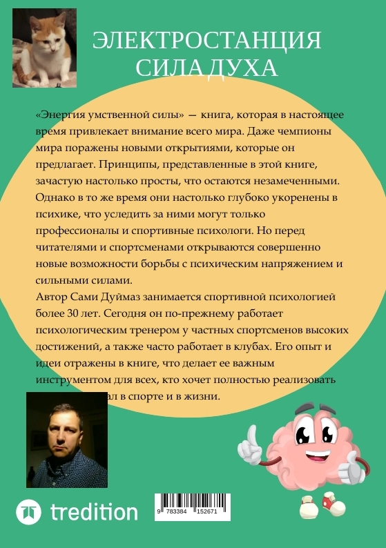 « » . , . , . , . , , , , , , . , « » , , , .«Energostantsiya umstvennoy sily» posvyashchena razvitiyu i ukrepleniyu umstvennykh sposobnostey v kontekste sporta i povsednevnoy zhizni. Kniga predstavlyayet soboy kompleksnoye rukovodstvo po povysheniyu umstvennoy sily dlya preodoleniya trudnostey, dostizheniya tseley i preodoleniya predelov lichnoy effektivnosti.Eto pomogayet preodolet' samosabotazh, ustranit' blokirovki i dobit'sya maksimal'noy effektivnosti v reshayushchiye momenty. Kniga osnovana na glubokikh znaniyakh sportivnoy psikhologii i drugikh smezhnykh oblastyakh i predlagayet prakticheskiye uprazhneniya i strategii, kotoryye mozhno legko realizovat'.On prednaznachen dlya sportsmenov, trenerov, sportivnykh psikhologov, studentov, issledovateley i obychnykh chitateley, interesuyushchikhsya temami psikhicheskogo zdorov'ya, lichnostnogo razvitiya i samosovershenstvovaniya.V tselom, «Energostantsiya umstvennoy sily» predlagayet raznoobraznuyu informatsiyu, strategii i uprazhneniya, kotoryye mogut pomoch' chitatelyam uluchshit' svoyu umstvennuyu silu i polnost'yu raskryt' svoy potentsial, bud' to v sporte ili v povsednevnoy zhizni.