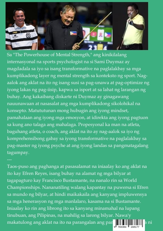Sa "The Powerhouse of Mental Strength," ang kinikilalang internasyonal na sports psychologist na si Sami Duymaz ay magdadala sa iyo sa isang transformative na paglalakbay sa mga kumplikadong layer ng mental strength sa konteksto ng sport. Nag-aalok ang aklat na ito ng isang susi sa pag-unawa at pag-optimize ng iyong lakas ng pag-iisip, kapwa sa isport at sa lahat ng larangan ng buhay. Ang kakaibang diskarte ni Duymaz ay ginagawang nauunawaan at nasasalat ang mga kumplikadong sikolohikal na konsepto. Matututunan mong hubugin ang iyong mindset, pamahalaan ang iyong mga emosyon, at idirekta ang iyong pagtuon sa kung ano talaga ang mahalaga. Propesyonal ka man na atleta, baguhang atleta, o coach, ang aklat na ito ay nag-aalok sa iyo ng komprehensibong gabay sa iyong transformative na paglalakbay sa pag-master ng iyong psyche at ang iyong landas sa pangmatagalang tagumpay.---Taos-puso ang paghanga at pasasalamat na iniaalay ko ang aklat na ito kay Efren Reyes, isang buhay na alamat ng mga bilyar at tagapagturo kay Francisco Bustamante, na nanalo rin sa World Championships. Nananatiling walang kapantay na puwersa si Efren sa mundo ng bilyar, at hindi maikakaila ang kanyang impluwensya sa mga henerasyon ng mga manlalaro, kasama na si Bustamante. Iniaalay ko rin ang librong ito sa kanyang minamahal na lupang tinubuan, ang Pilipinas, na mahilig sa larong bilyar. Nawa'y makatulong ang aklat na ito na parangalan ang pambihirang karera ni Efren at patuloy na palaganapin ang sigasig para sa larong bilyar.
