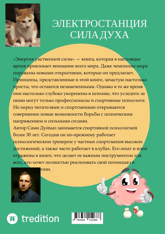 « » . , . , . , . , , , , , , . , « » , , , .«Energostantsiya umstvennoy sily» posvyashchena razvitiyu i ukrepleniyu umstvennykh sposobnostey v kontekste sporta i povsednevnoy zhizni. Kniga predstavlyayet soboy kompleksnoye rukovodstvo po povysheniyu umstvennoy sily dlya preodoleniya trudnostey, dostizheniya tseley i preodoleniya predelov lichnoy effektivnosti.Eto pomogayet preodolet' samosabotazh, ustranit' blokirovki i dobit'sya maksimal'noy effektivnosti v reshayushchiye momenty. Kniga osnovana na glubokikh znaniyakh sportivnoy psikhologii i drugikh smezhnykh oblastyakh i predlagayet prakticheskiye uprazhneniya i strategii, kotoryye mozhno legko realizovat'.On prednaznachen dlya sportsmenov, trenerov, sportivnykh psikhologov, studentov, issledovateley i obychnykh chitateley, interesuyushchikhsya temami psikhicheskogo zdorov'ya, lichnostnogo razvitiya i samosovershenstvovaniya.V tselom, «Energostantsiya umstvennoy sily» predlagayet raznoobraznuyu informatsiyu, strategii i uprazhneniya, kotoryye mogut pomoch' chitatelyam uluchshit' svoyu umstvennuyu silu i polnost'yu raskryt' svoy potentsial, bud' to v sporte ili v povsednevnoy zhizni.