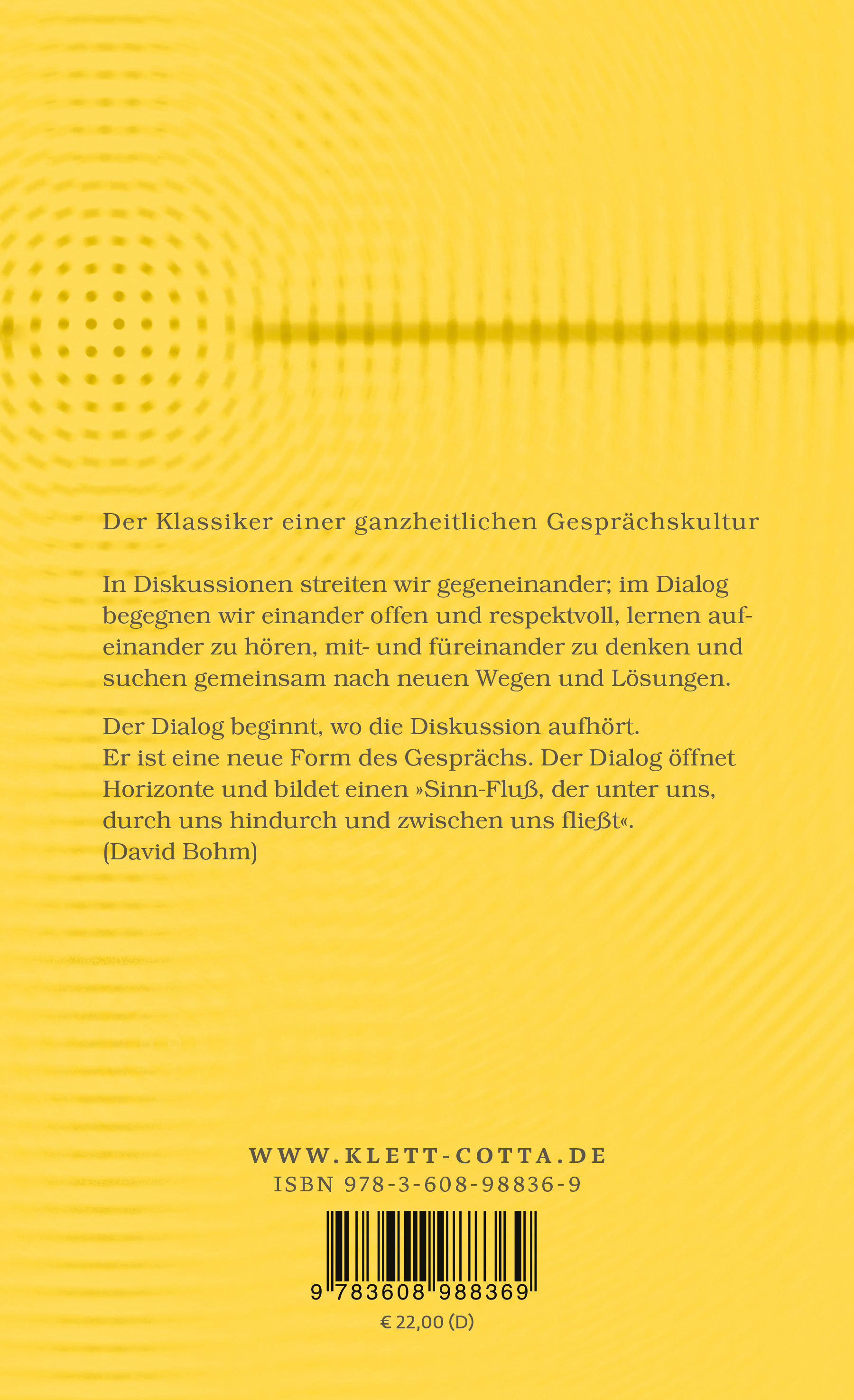 Der Physiker David Bohm, von dem Einstein sagte, er sei der einzige, der über die Quantentheorie hinauskommen könne, war nicht nur ein berühmter Naturwissenschaftler, sondern auch ein Philosoph im ursprünglichen Sinne. Er gab dem Gespräch, dem Dialog seine Tiefe zurück, die ihm im Zeitalter der Kommunikation und Diskussion abhanden gekommen ist.