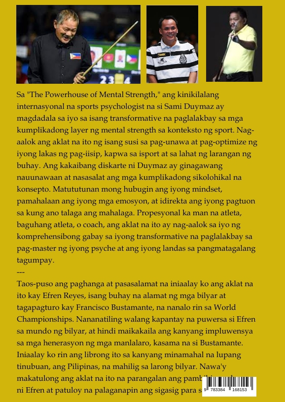 Sa "The Powerhouse of Mental Strength," ang kinikilalang internasyonal na sports psychologist na si Sami Duymaz ay magdadala sa iyo sa isang transformative na paglalakbay sa mga kumplikadong layer ng mental strength sa konteksto ng sport. Nag-aalok ang aklat na ito ng isang susi sa pag-unawa at pag-optimize ng iyong lakas ng pag-iisip, kapwa sa isport at sa lahat ng larangan ng buhay. Ang kakaibang diskarte ni Duymaz ay ginagawang nauunawaan at nasasalat ang mga kumplikadong sikolohikal na konsepto. Matututunan mong hubugin ang iyong mindset, pamahalaan ang iyong mga emosyon, at idirekta ang iyong pagtuon sa kung ano talaga ang mahalaga. Propesyonal ka man na atleta, baguhang atleta, o coach, ang aklat na ito ay nag-aalok sa iyo ng komprehensibong gabay sa iyong transformative na paglalakbay sa pag-master ng iyong psyche at ang iyong landas sa pangmatagalang tagumpay.---Taos-puso ang paghanga at pasasalamat na iniaalay ko ang aklat na ito kay Efren Reyes, isang buhay na alamat ng mga bilyar at tagapagturo kay Francisco Bustamante, na nanalo rin sa World Championships. Nananatiling walang kapantay na puwersa si Efren sa mundo ng bilyar, at hindi maikakaila ang kanyang impluwensya sa mga henerasyon ng mga manlalaro, kasama na si Bustamante. Iniaalay ko rin ang librong ito sa kanyang minamahal na lupang tinubuan, ang Pilipinas, na mahilig sa larong bilyar. Nawa'y makatulong ang aklat na ito na parangalan ang pambihirang karera ni Efren at patuloy na palaganapin ang sigasig para sa larong bilyar.