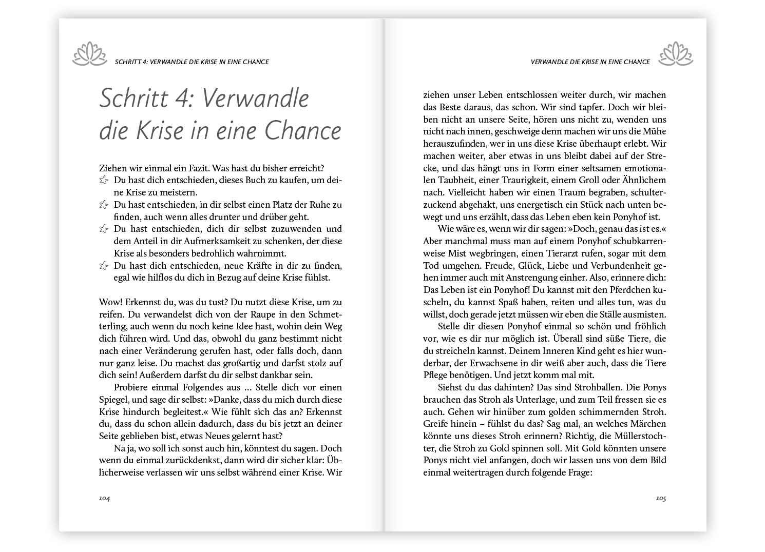 ((Auszug))SCHRITT 2: WER IN DIR HAT AM MEISTEN STRESS?In einer Krise sind wir überwältigt, wir stellen alles infrage, wir verlieren den Boden unter den Füßen, wir sind verzweifelt, werden unfähig zu handeln und wollen nur noch eines: So schnell wie möglich unsere Klarheit und unsere innere Ruhe wiederfinden. Es fühlt sich an, als wären wir in unserer Gesamtheit erschüttert - doch was wäre, wenn das gar nicht stimmte?Es fühlt sich nur so an, weil wir aus unserer Mitte herauskatapultiert wurden.Stellen wir uns doch einmal vor, unser Inneres, also unsere Innenwelt, unsere Gedanken, unsere Gefühle, unser Erleben, unser Planen, unsere Wünsche, unsere Träume, unsere Hoffnungen, unsere Ressourcen und alles, was uns ausmacht, wären wie eine Landschaft mit verschiedenen Bereichen. In diesen unterschiedlichen Bereichen leben unsere inneren Kräfte, die alles, was wir wollen, planen, tun, fühlen und brauchen, in die Außenwelt bringen und durch Handlungen sichtbar werden lassen. Das, was wir in der Welt bewegen, sind immer von innen nach außen gebrachte Kräfte, egal, was wir tun. Unser Leben entsteht also innen, in unseren Impulsen und Plänen, in dem, was wir bewusst und unbewusst wollen, und letztlich durch das, was wir dann tatsächlich tun. Nun ist eine Abrissbirne von außen durch deine Innenwelt gedonnert und hat alles durcheinandergebracht.Alles? Nein, nicht alles! Da gibt es dieses kleine Dorf ... Du weißt schon. Machen wir uns doch auf die Suche nach den Kräften, die unbehelligt geblieben sind, denn diese Kräfte brauchen wir jetzt, um die Krise zu meistern. (...)AKTIVIERE DEINE INNEREN KRÄFTEDir deine Innenwelt genau vorzustellen ist deshalb gut, weil wir, wenn wir unsere innere Landschaft fühlen und als real erleben, noch besser auf unsere Kräfte zurückgreifen können.Lass uns jetzt mithilfe dieses inneren Bildes herausfinden, ob es bestimmte innere Anteile gibt, die die Krise stärker empfinden als andere. Für wen in dir ist das Ganze am schlimmsten? Dadurch können wir erkennen, welche inneren Kräfte aktiviert werden dürfen, um die Krise so zu meistern, dass es sich anfühlt, als würdest du wie im Märchen Rumpelstilzchen Stroh zu Gold spinnen und gestärkt aus allen Schwierigkeiten hervorgehen.Es kann sogar sein, dass der innere Anteil, der sich am meisten bedroht fühlt, in Wahrheit überhaupt nichts mit dem, was dir gerade geschieht, zu tun hat und einfach nur an einen inneren, sicheren Ort gebracht werden muss, damit du wieder handeln kannst. Finden wir es heraus. Bist du bereit? Dann los!- Wer oder was in mir erlebt die Krise am stärksten? -Nimm dir etwas zu schreiben, ein paar Gegenstände wie Büroklammern, Steinchen oder Spielfiguren, und ein großes Blatt Papier.Male einen Kreis und unterteile ihn in Viertel. Markiere die Mitte mit einem Kreis.Schreibe in eines der Viertel "Gefühle, Verletzlichkeit". In das gegenüberliegende Viertel schreibst du "Vernunft, Kommunikation". Lege jetzt das Papier so, dass der Bereich "Gefühle, Verletzlichkeit" direkt vor dir liegt, also auf deinen Bauch zeigt. Auf das von dir aus gesehene freie linke Viertel schreibst du "Stabilität, Ressourcen" und auf das von dir aus gelegene rechte Viertel schreibst du "Tatkraft, Handlungsfreiheit". Genau mitten ins Zentrum schreibst du "Mitte".Lege deine Gegenstände griffbereit vor dich hin.Denke jetzt an deine Krise, und nimm den ersten der kleinen Gegenstände in die Hand. Entscheide rasch: (...)