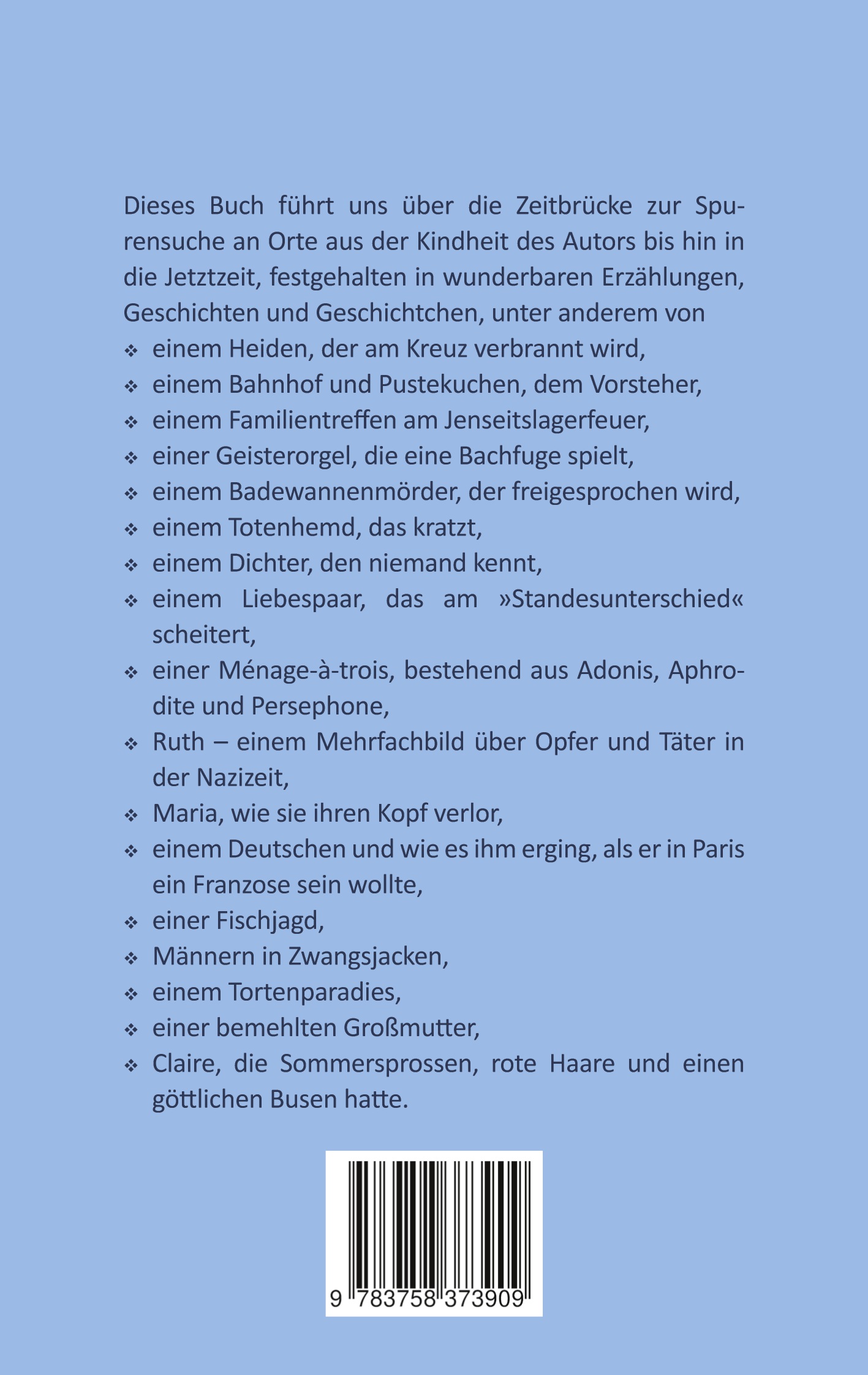 Tauchen Sie ein in eine Welt voller Erinnerungen und Träume - Kurzgeschichten, die das Herz berühren und den Geist beflügeln!Dieses Buch führt uns über die Zeitbrücke zur Spurensuche an Orte aus der Kindheit des Autors bis zur Jetztzeit, festgehalten in wunderbaren Erzählungen, Geschichten und Geschichtchen, unter anderem von * einem Heiden, der am Kreuz verbrannt wird,* einem Bahnhof und Pustekuchen, dem Vorsteher, * einem Familientreffen am Jenseitslagerfeuer * einer Geisterorgel, die eine Bachfuge spielt,* einem Badewannenmörder, der freigesprochen wird, * einem Totenhemd, das kratzt, * einem Dichter, den niemand kennt, * einem Liebespaar, das am »Standesunterschied« scheitert, * einer Ménage-à-trois, bestehend aus Adonis, Aphrodite und Persephone, * Ruth - einem Mehrfachbild über Opfer und Täter in der Nazizeit, * Maria, wie sie ihren Kopf verlor, * einem Deutschen und wie es ihm erging, als er in Paris ein Franzose sein wollte, * einer Fischjagd, * Männern in Zwangsjacken,* einem Tortenparadies, * einer bemehlten Großmutter, * Claire, die Sommersprossen, rote Haare und einen göttlichen Busen hatte.