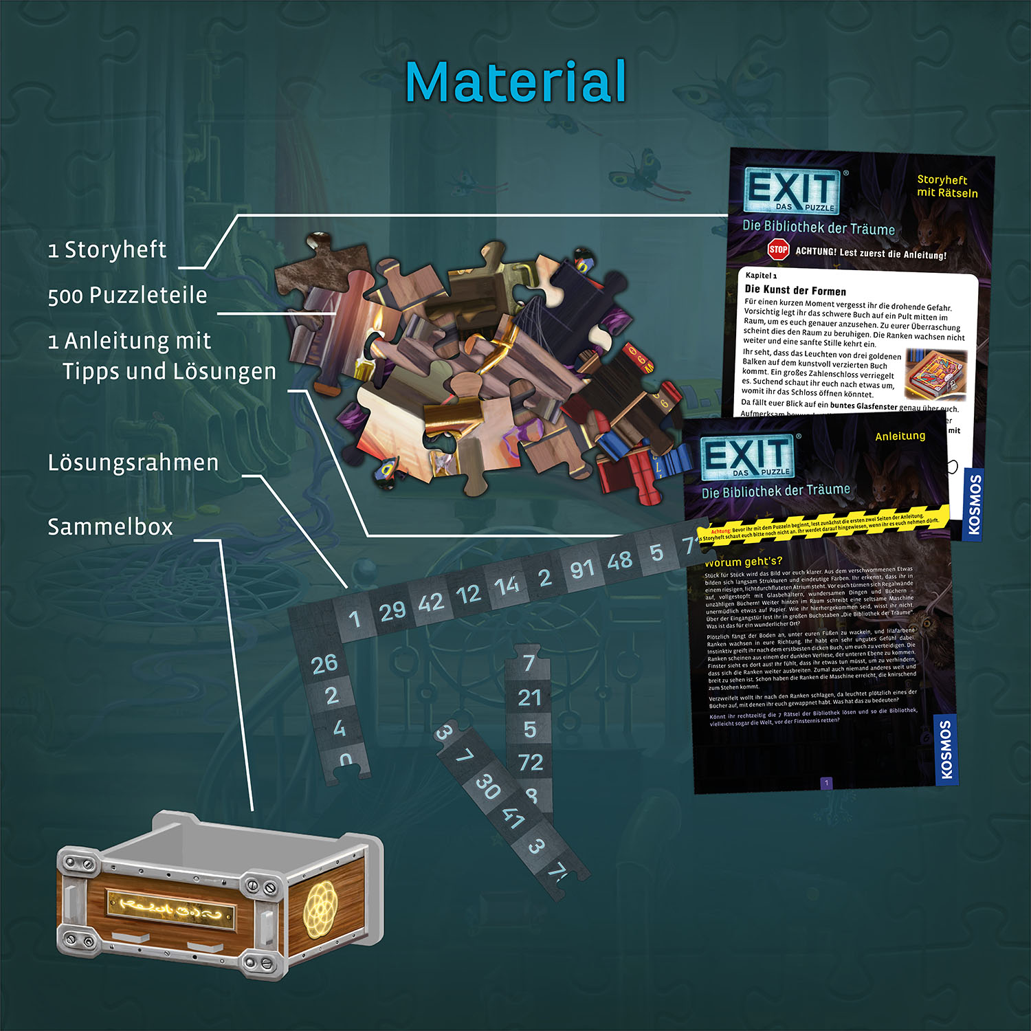 Die fantastische Bibliothek der Träume ist in Gefahr! Der Boden wackelt, Ranken wachsen aus einem Verlies und schwarzer Nebel steigt auf. Können die Puzzlerinnen und Puzzler ab zehn Jahren verhindern, dass sich die Finsternis weiter ausbreitet? Dazu legen sie zunächst das Motiv mit 500 Teilen und entdecken spannende Details. Im Anschluss tauchen sie mit der spannenden Story in das Bild ein und lösen sieben abwechslungsreiche Rätsel. Mit jedem gelösten Rätsel kommen die Puzzelnden dem Geheimnis der Bibliothek auf die Schliche. Kann die Bibliothek gerettet werden? Ein stimmungsvolles Puzzle zum Mitfiebern.