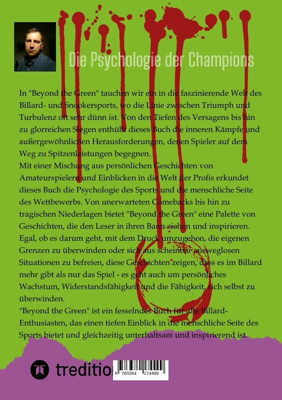 In "Jenseits des Grüns" geht es um die faszinierende Welt des Billard- und Snookersports und die psychologischen Herausforderungen, denen Spieler auf ihrem Weg zu Spitzenleistungen begegnen. Das Buch erkundet die menschliche Seite des Wettbewerbs und beleuchtet die inneren Kämpfe, Triumphmomente und Rückschläge, die Spieler erfahren. Es bietet eine Sammlung von Geschichten von Amateurspielern und Einblicken in die Welt der Profis, die den Leser in ihren Bann ziehen und inspirieren sollen. Von unerwarteten Comebacks bis hin zu tragischen Niederlagen zeigt "Jenseits des Grüns", dass der Billard- und Snookersport nicht nur ein Spiel, sondern auch eine Reise des persönlichen Wachstums, der Widerstandsfähigkeit und der Selbstüberwindung ist.