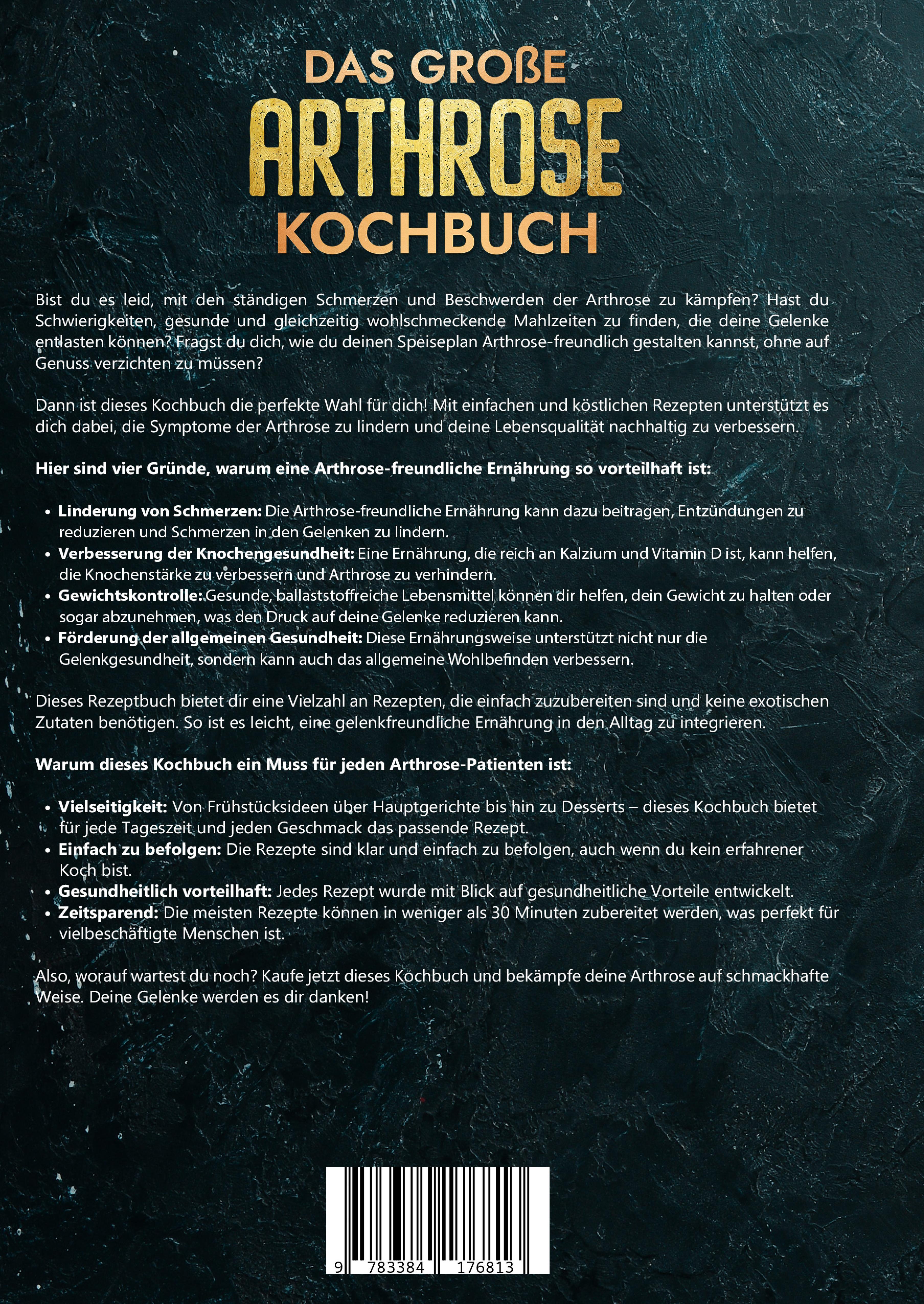 Bist du es leid, mit den ständigen Schmerzen und Beschwerden der Arthrose zu kämpfen? Hast du Schwierigkeiten, gesunde und gleichzeitig wohlschmeckende Mahlzeiten zu finden, die deine Gelenke entlasten können? Fragst du dich, wie du deinen Speiseplan Arthrose-freundlich gestalten kannst, ohne auf Genuss verzichten zu müssen?Dann ist dieses Kochbuch die perfekte Wahl für dich! Mit einfachen und köstlichen Rezepten unterstützt es dich dabei, die Symptome der Arthrose zu lindern und deine Lebensqualität nachhaltig zu verbessern.Hier sind vier Gründe, warum eine Arthrose-freundliche Ernährung so vorteilhaft ist:- Linderung von Schmerzen: Die Arthrose-freundliche Ernährung kann dazu beitragen, Entzündungen zu reduzieren und Schmerzen in den Gelenken zu lindern.- Verbesserung der Knochengesundheit: Eine Ernährung, die reich an Kalzium und Vitamin D ist, kann helfen, die Knochenstärke zu verbessern und Arthrose zu verhindern.- Gewichtskontrolle: Gesunde, ballaststoffreiche Lebensmittel können dir helfen, dein Gewicht zu halten oder sogar abzunehmen, was den Druck auf deine Gelenke reduzieren kann.- Förderung der allgemeinen Gesundheit: Diese Ernährungsweise unterstützt nicht nur die Gelenkgesundheit, sondern kann auch das allgemeine Wohlbefinden verbessern.Dieses Rezeptbuch bietet dir eine Vielzahl an Rezepten, die einfach zuzubereiten sind und keine exotischen Zutaten benötigen. So ist es leicht, eine gelenkfreundliche Ernährung in den Alltag zu integrieren.Warum dieses Kochbuch ein Muss für jeden Arthrose-Patienten ist:- Vielseitigkeit: Von Frühstücksideen über Hauptgerichte bis hin zu Desserts - dieses Kochbuch bietet für jede Tageszeit und jeden Geschmack das passende Rezept.- Einfach zu befolgen: Die Rezepte sind klar und einfach zu befolgen, auch wenn du kein erfahrener Koch bist.- Gesundheitlich vorteilhaft: Jedes Rezept wurde mit Blick auf gesundheitliche Vorteile entwickelt.- Zeitsparend: Die meisten Rezepte können in weniger als 30 Minuten zubereitet werden, was perfekt für vielbeschäftigte Menschen ist.Also, worauf wartest du noch? Kaufe jetzt dieses Kochbuch und bekämpfe deine Arthrose auf schmackhafte Weise. Deine Gelenke werden es dir danken!