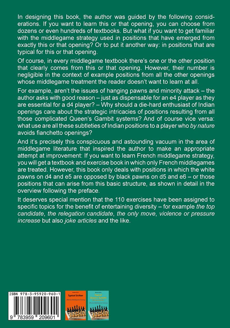 In designing this book, the author was guided by the following consid- erations. If you want to learn this or that opening, you can choose from dozens or even hundreds of textbooks. But what if you want to get familiar with the middlegame strategy used in positions that have emerged from exactly this or that opening? Or to put it another way: in positions that are typical for this or that opening.Of course, in every middlegame textbook there's one or the other position that clearly comes from this or that opening. However, their number is negligible in the context of example positions from all the other openings whose middlegame treatment the reader doesn't want to learn at all.For example, aren't the issues of hanging pawns and minority attack - the author asks with good reason - just as dispensable for an e4 player as they are essential for a d4 player? - Why should a die-hard enthusiast of Indian openings care about the strategic intricacies of positions resulting from all those complicated Queen's Gambit systems? And of course vice versa: what use are all these subtleties of Indian positions to a player who by nature avoids fianchetto openings?And it's precisely this conspicuous and astounding vacuum in the area of middlegame literature that inspired the author to make an appropriate attempt at improvement: If you want to learn French middlegame strategy, you will get a textbook and exercise book in which only French middlegames are treated. However, this book only deals with positions in which the white pawns on d4 and e5 are opposed by black pawns on d5 and e6 - or those positions that can arise from this basic structure, as shown in detail in the overview following the preface.It deserves special mention that the 110 exercises have been assigned to specific topics for the benefit of entertaining diversity - for example the top candidate, the relegation candidate, the only move, violence or pressure increase but also joke articles and the like.