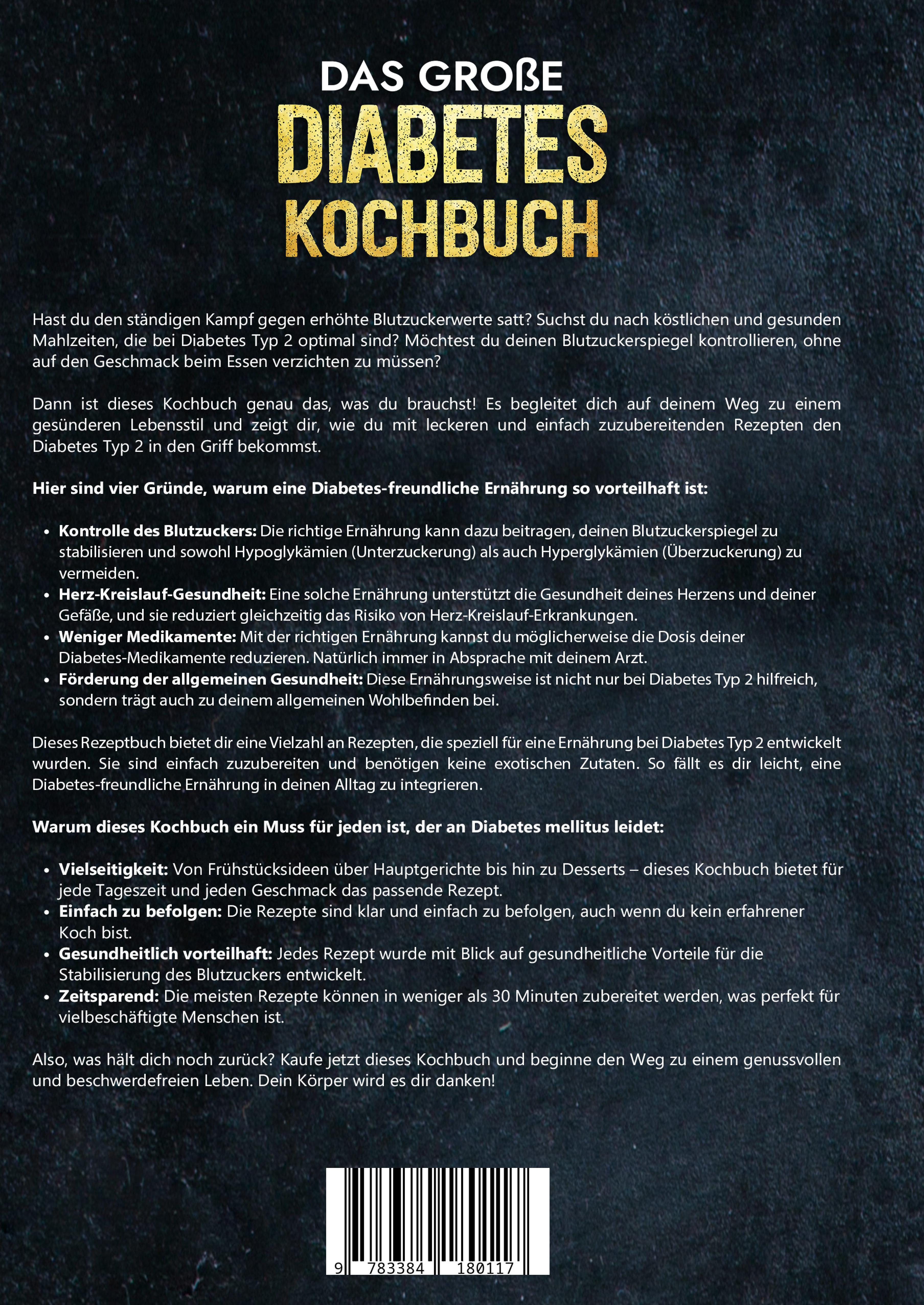 Hast du den ständigen Kampf gegen erhöhte Blutzuckerwerte satt? Suchst du nach köstlichen und gesunden Mahlzeiten, die bei Diabetes Typ 2 optimal sind? Möchtest du deinen Blutzuckerspiegel kontrollieren, ohne auf den Geschmack beim Essen verzichten zu müssen?Dann ist dieses Kochbuch genau das, was du brauchst! Es begleitet dich auf deinem Weg zu einem gesünderen Lebensstil und zeigt dir, wie du mit leckeren und einfach zuzubereitenden Rezepten den Diabetes Typ 2 in den Griff bekommst.Hier sind vier Gründe, warum eine Diabetes-freundliche Ernährung so vorteilhaft ist:- Kontrolle des Blutzuckers: Die richtige Ernährung kann dazu beitragen, deinen Blutzuckerspiegel zu stabilisieren und sowohl Hypoglykämien (Unterzuckerung) als auch Hyperglykämien (Überzuckerung) zu vermeiden.- Herz-Kreislauf-Gesundheit: Eine solche Ernährung unterstützt die Gesundheit deines Herzens und deiner Gefäße, und sie reduziert gleichzeitig das Risiko von Herz-Kreislauf-Erkrankungen.- Weniger Medikamente: Mit der richtigen Ernährung kannst du möglicherweise die Dosis deiner Diabetes-Medikamente reduzieren. Natürlich immer in Absprache mit deinem Arzt.- Förderung der allgemeinen Gesundheit: Diese Ernährungsweise ist nicht nur bei Diabetes Typ 2 hilfreich, sondern trägt auch zu deinem allgemeinen Wohlbefinden bei.Dieses Rezeptbuch bietet dir eine Vielzahl an Rezepten, die speziell für eine Ernährung bei Diabetes Typ 2 entwickelt wurden. Sie sind einfach zuzubereiten und benötigen keine exotischen Zutaten. So fällt es dir leicht, eine Diabetes-freundliche Ernährung in deinen Alltag zu integrieren.Warum dieses Kochbuch ein Muss für jeden ist, der an Diabetes mellitus leidet:- Vielseitigkeit: Von Frühstücksideen über Hauptgerichte bis hin zu Desserts - dieses Kochbuch bietet für jede Tageszeit und jeden Geschmack das passende Rezept.- Einfach zu befolgen: Die Rezepte sind klar und einfach zu befolgen, auch wenn du kein erfahrener Koch bist.- Gesundheitlich vorteilhaft: Jedes Rezept wurde mit Blick auf gesundheitliche Vorteile für die Stabilisierung des Blutzuckers entwickelt.- Zeitsparend: Die meisten Rezepte können in weniger als 30 Minuten zubereitet werden, was perfekt für vielbeschäftigte Menschen ist.Also, was hält dich noch zurück? Kaufe jetzt dieses Kochbuch und beginne den Weg zu einem genussvollen und beschwerdefreien Leben. Dein Körper wird es dir danken!