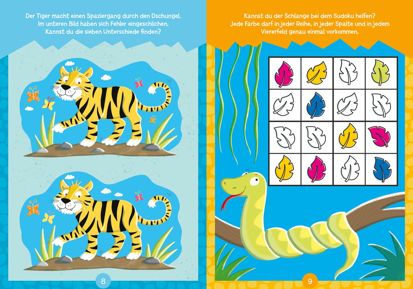 Bunter Rätselspaß für kleine Tier-Fans. Mit liebevollen Illustrationen wilder Tiere tauchen Kinder ab 4 Jahren ein in die Welt der Rätsel. Labyrinthe, Sudokus, Paare finden, Unterschiede erkennen: Hier wird gerätselt, gemalt und gezählt. Eine tolle und abwechslungsreiche Beschäftigung, die Köpfchen und Kreativität beweist. Die 29 Rätsel machen nicht nur Spaß, sondern fördern auch die Feinmotorik und die Konzentration.