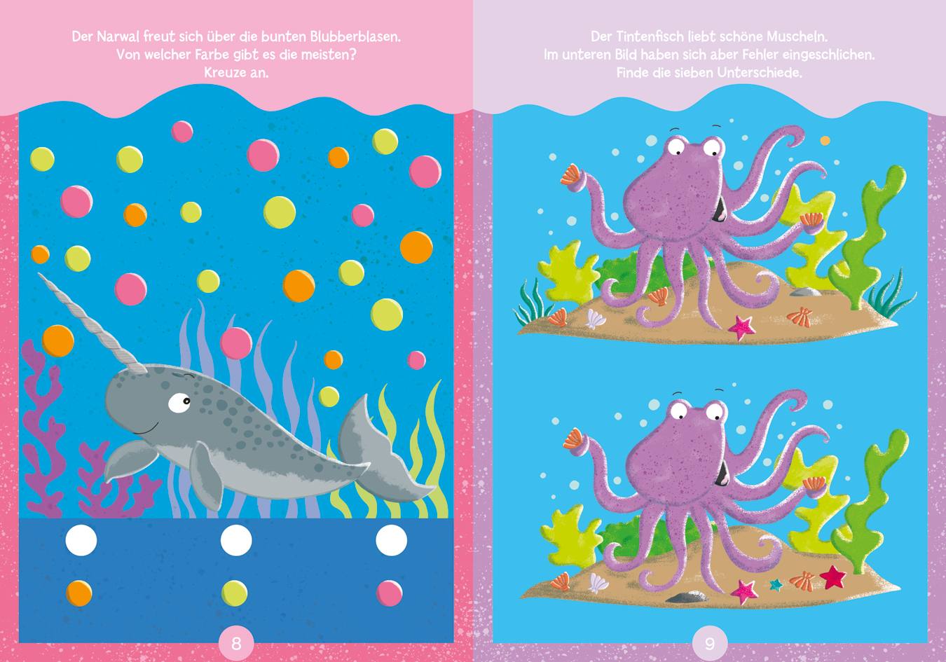 Bunter Rätselspaß für kleine Meeres-Fans. Mit liebevollen Illustrationen bunter Unterwasser-Tiere tauchen Kinder ab 4 Jahren ein in die Welt der Rätsel. Labyrinthe, Sudokus, Paare finden, Unterschiede erkennen: Hier wird gerätselt, gemalt und gezählt. Eine tolle und abwechslungsreiche Beschäftigung, die Köpfchen und Kreativität beweist. Von Tintenfisch, Seepferdchen und Haien sind viele weitere Unterwassertiere zu finden. Schon mal einen Igel in der Unterwasserwelt gesehen? Welcher Gegenstand gehört nicht ins Meer? Welches Zierfisch-Paar gehört zusammen und was stimmt mit den Schatten des exotischen Seedrachens? Die 29 Rätsel machen nicht nur Spaß, sondern fördern auch die Feinmotorik und die Konzentration.