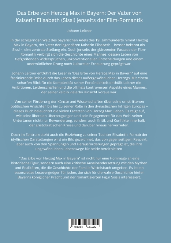 Das Erbe von Herzog Max in Bayern: Der Vater von Kaiserin Elisabeth (Sissi) jenseits der Film-RomantikJohann LeitnerIn der schillernden Welt des bayerischen Adels des 19. Jahrhunderts nimmt Herzog Max in Bayern, der Vater der legendären Kaiserin Elisabeth - besser bekannt als Sissi -, eine zentrale Stellung ein. Doch jenseits der glänzenden Fassade der Film-Romantik verbirgt sich die Geschichte eines Mannes, dessen Leben von tiefgreifenden Widersprüchen, unkonventionellen Entscheidungen und einem unermüdlichen Drang nach kultureller Erneuerung geprägt war.Johann Leitner entführt die Leser in "Das Erbe von Herzog Max in Bayern" auf eine faszinierende Reise durch das Leben dieses außergewöhnlichen Herzogs. Mit einem scharfen Blick für die Komplexität seiner Persönlichkeit enthüllt Leitner die Ambitionen, Leidenschaften und die oftmals kontroversen Aspekte eines Mannes, der seiner Zeit in vielerlei Hinsicht voraus war.Von seiner Förderung der Künste und Wissenschaften über seine umstrittenen politischen Ansichten bis hin zu seiner Rolle in den dynastischen Intrigen Europas - dieses Buch beleuchtet die vielen Facetten von Herzog Max' Leben. Es zeigt auf, wie seine liberalen Überzeugungen und sein Engagement für das Wohl seiner Untertanen nicht nur Bewunderung, sondern auch Kritik und Konflikte innerhalb der aristokratischen Kreise und darüber hinaus hervorriefen.Doch im Zentrum steht auch die Beziehung zu seiner Tochter Elisabeth. Fernab der idyllischen Darstellungen wird ein Bild gezeichnet, das von gegenseitigem Respekt, aber auch von den Spannungen und Herausforderungen geprägt ist, die ihre ungewöhnlichen Lebenswege für beide bereithielten."Das Erbe von Herzog Max in Bayern" ist nicht nur eine Hommage an eine historische Figur, sondern auch eine kritische Auseinandersetzung mit den Mythen und Realitäten, die die Geschichte der Familie Wittelsbach umgeben. Es ist ein essenzielles Lesevergnügen für jeden, der sich für die wahre Geschichte hinter Bayerns königlicher Pracht und der romantisierten Figur Sissis interessiert.