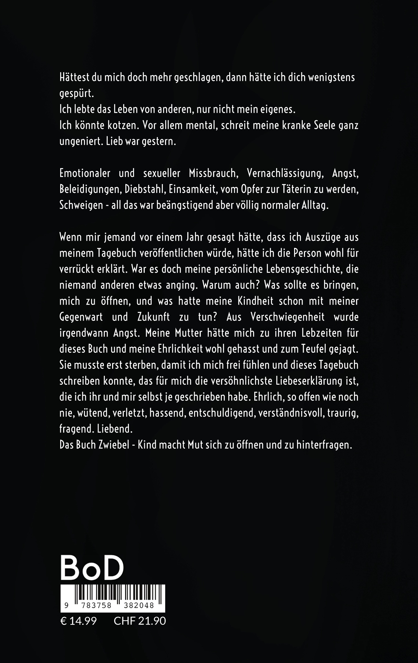 Von der Dunkelheit ins Licht: Eine bewegende Autobiografie über Missbrauch, Einsamkeit und den Weg zur Selbstliebe.Hättest du mich doch mehr geschlagen, dann hätte ich dich wenigstens gespürt. Ich lebte das Leben von anderen - nur nicht mein eigenes. Ich könnte kotzen. Vor allem mental schreit meine kranke Seele ganz ungeniert. Lieb war gestern.Emotionaler und sexueller Missbrauch, Vernachlässigung, Angst, Beleidigungen, Diebstahl, Einsamkeit, vom Opfer zur Täterin zu werden, Schweigen - all das war beängstigend, aber völlig normaler Alltag. Wenn mir jemand vor einem Jahr gesagt hätte, dass ich Auszüge aus meinem Tagebuch veröffentlichen würde, hätte ich die Person wohl für verrückt erklärt. War es doch meine persönliche Lebensgeschichte, die niemandem etwas anging. Warum auch? Was sollte es bringen, mich zu öffnen, und was hatte meine Kindheit schon mit meiner Gegenwart und Zukunft zu tun? Aus Verschwiegenheit wurde irgendwann Angst. Meine Mutter hätte mich zu ihren Lebzeiten für dieses Buch und meine Ehrlichkeit wohl gehasst und zum Teufel gejagt. Sie musste erst sterben, damit ich mich frei fühlen und dieses Tagebuch schreiben konnte, das für mich die versöhnlichste Liebeserklärung ist, die ich ihr und mir selbst je geschrieben habe. Ehrlich, so offen wie noch nie, wütend, verletzt, hassend, entschuldigend, verständnisvoll, traurig, fragend. Liebend.Das Buch "Zwiebel - Kind" macht Mut, sich zu öffnen und zu hinterfragen.