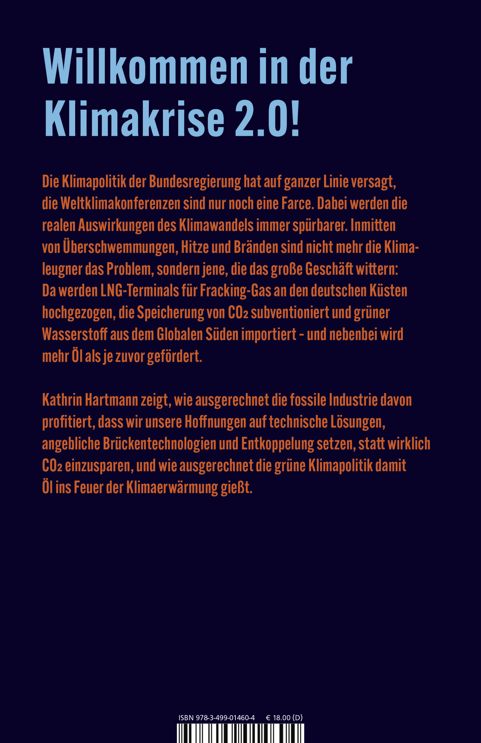 Die renommierte Journalistin Kathrin Hartmann zeigt, was Klimapolitik bei ständigem Wirtschaftswachstum bedeutet. Längst sind nicht mehr Klimaleugner das Problem, sondern jene, die mit dem Klimawandel das große Geschäft wittern. Und das sind vor allem die fossilen Energiekonzerne: Jetzt gibt es angeblich «sauberes» Flüssigerdgas, man träumt von grünem Wasserstoff, steigert auf dem Weg dahin den CO2-Ausstoß jedoch und greift zu gefährlichen Scheinlösungen wie «Carbon Management».