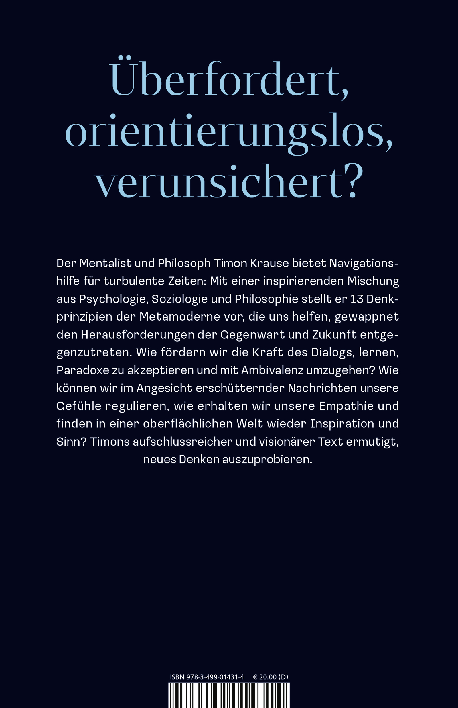 Überfordert, orientierungslos, verunsichert? Der Mentalist und Philosoph Timon Krause bietet Navigationshilfe durch turbulente Zeiten: Mit einer erfrischenden, praxisnahen Mischung aus Psychologie, Soziologie und Philosophie stellt er dreizehn Denkweisen vor, die uns helfen, gewappnet den Herausforderungen der Gegenwart und Zukunft entgegenzutreten. Wie fördern wir die Kraft des Dialogs, lernen, Paradoxe zu akzeptieren und mit Ambivalenz umzugehen? Wie können wir trotz aller Tragödien optimistisch bleiben? Timons aufschlussreicher, inspirierender und visionärer Text ermutigt, neues Denken auszuprobieren.