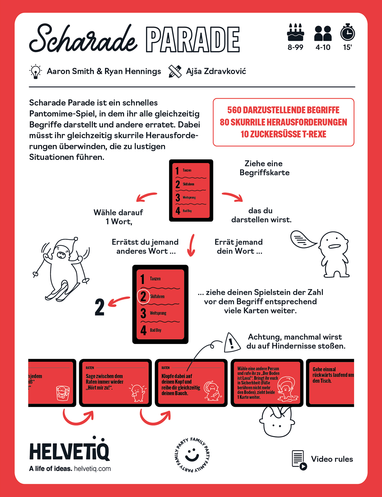 Scharade Parade ist ein wildes Partyspiel, bei dem alle gleichzeitig raten und mimen müssen. Schafft Platz, haltet die zerbrechlichen Gegenstände fern und stürzt euch ins Spiel!