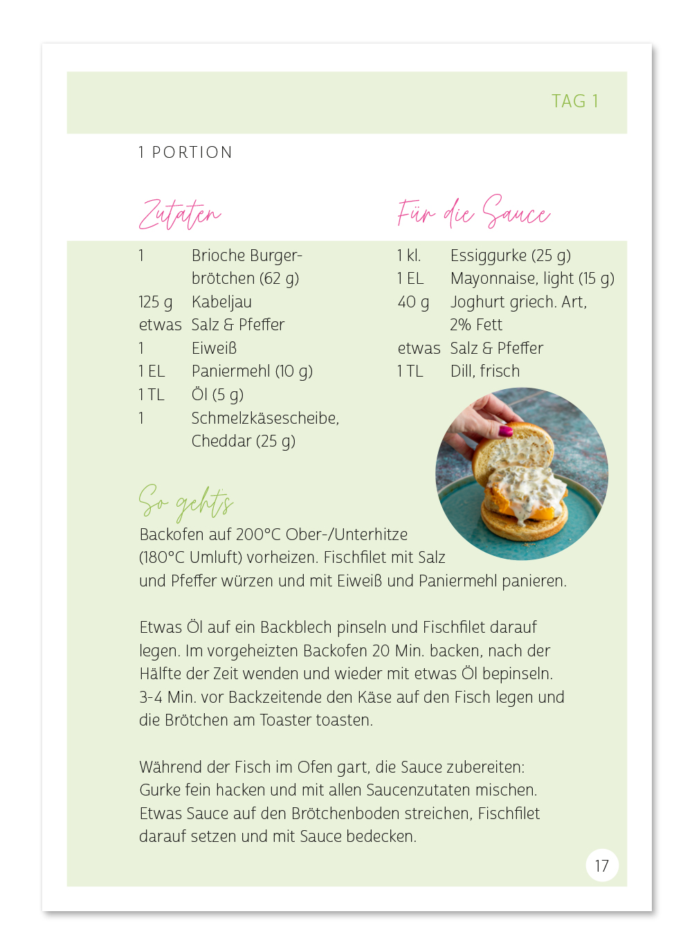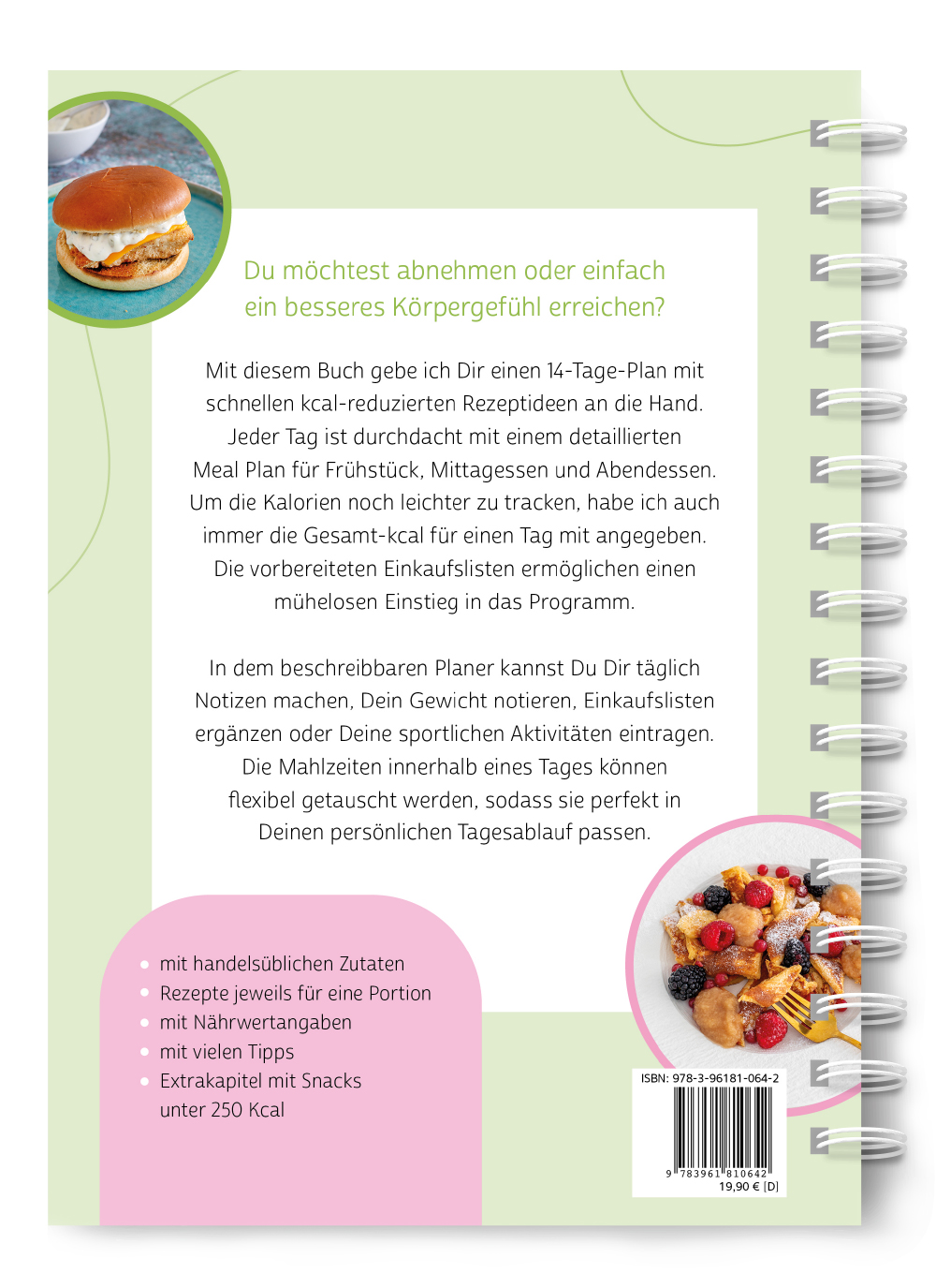 Es ist Zeit für VERÄNDERUNG, also fang an!Starte jetzt mit meinem 14-Tage-PlanMit diesem 14-Tage-Planer möchte ich Dir einen Einstieg in eine ausgewogene, proteinreiche Ernährung geben, mit der Du in 14 Tagen 2-3 Kilo abnehmen kannst.Wieso proteinreich?Eine proteinreiche Ernährung unterstützt das Immunsystem, hilft beim Muskelaufbau, beschleunigt den Stoffwechsel und die Fettverbrennung. Durch eine eiweißreiche Ernährung, bei der man zugleich auch den Anteil an Kohlenhydraten reduziert, wird der Körper dazu gezwungen, überschüssiges Fett abzubauen. Ein weiterer Vorteil ist, dass eine proteinreiche Ernährung den Blutzuckerspiegel stabil hält und so Heißhungerattacken vorbeugt.Wichtig: Ausreichend trinken! Denn die Stoffwechselprodukte aus Proteinen scheidet der Körper über die Nieren/Urin aus. Man benötigt deshalb ausreichend Flüssigkeit (Wasser, ungesüßte Tees), damit die Nieren gut funktionieren. Erwachsene sollten mindestens 1,5 bis 2 Liter trinken, um einem Wassermangel vorzubeugen.Auf den nächsten Seiten findest Du alle Infos zum Start, Einkaufslisten sowie tägliche Rezepte. Solltest Du viel Sport treiben oder einen höheren kcal-Verbrauch haben, findest Du im hinteren Teil des Planers noch kleine Snacks, um Deinen Bedarf zu decken. Also... Los geht´s!