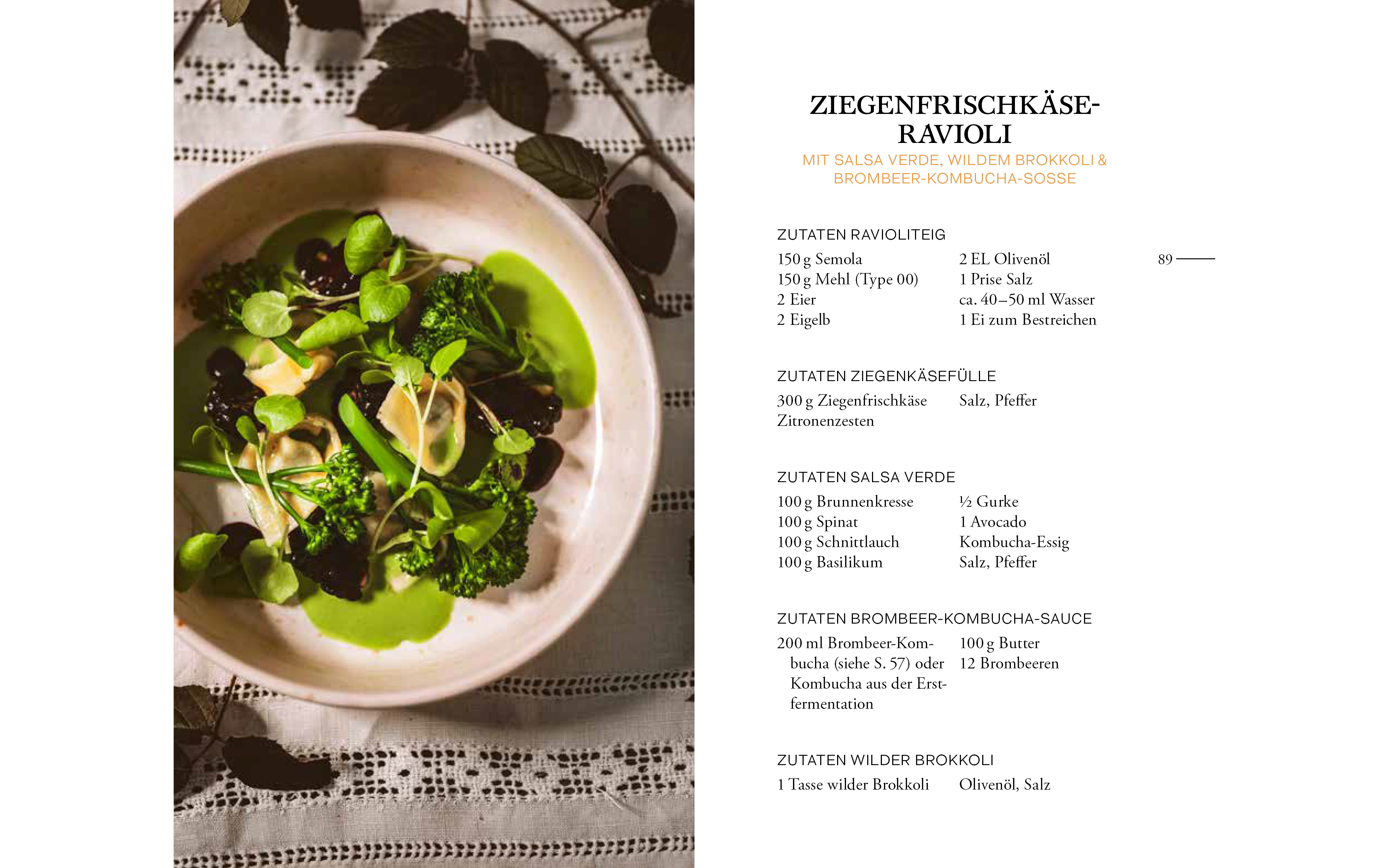 "Es werden 13 fruchtbare Rezepte für aromatischen Kombucha-Getränke wie Erdbeer-Minz-Kombucha-Spritz, Gurke und Zitronenverbene oder Kaffee-Kombucha präsentiert. Danach folgen Gerichte wie Ziegenfrischkäse-Ravioli mit Salsa Verde, wildem Brokkoli und Brombeer-Kombucha-Soße, Ceviche von der Forelle mit Granatapfel, Sellerie und Sushi-Ingwer oder Kombucha-Tiramisu." *scharf-links.de