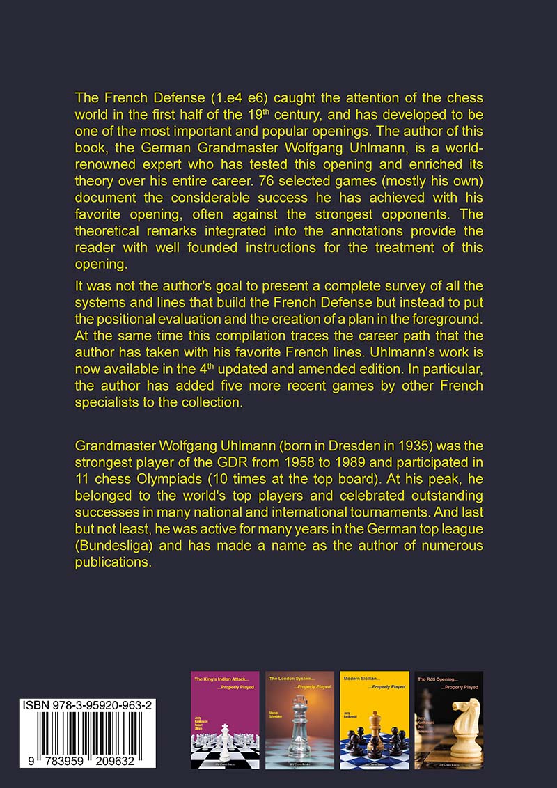 The French Defense (1.e4 e6) caught the attention of the chess world in the first half of the 19th century, and has developed to be one of the most important and popular openings. The author of this book, the German Grandmaster Wolfgang Uhlmann, is a world-renowned expert who has tested this opening and enriched its theory over his entire career. 76 selected games (mostly his own) document the considerable success he has achieved with his favorite opening, often against the strongest opponents. The theoretical remarks integrated into the annotations provide the reader with well founded instructions for the treatment of this opening.It was not the author's goal to present a complete survey of all the systems and lines that build the French Defense but instead to put the positional evaluation and the creation of a plan in the foreground. At the same time this compilation traces the career path that the author has taken with his favorite French lines. Uhlmann's work is now available in the 4th updated and amended edition. In particular, the author has added five more recent games by other French specialists to the collection. Grandmaster Wolfgang Uhlmann (born in Dresden in 1935) was the strongest player of the GDR from 1958 to 1989 and participated in 11 chess Olympiads (10 times at the top board). At his peak, he belonged to the world's top players and celebrated outstanding successes in many national and international tournaments. And last but not least, he was active for many years in the German top league (Bundesliga) and has made a name as the author of numerous publications.