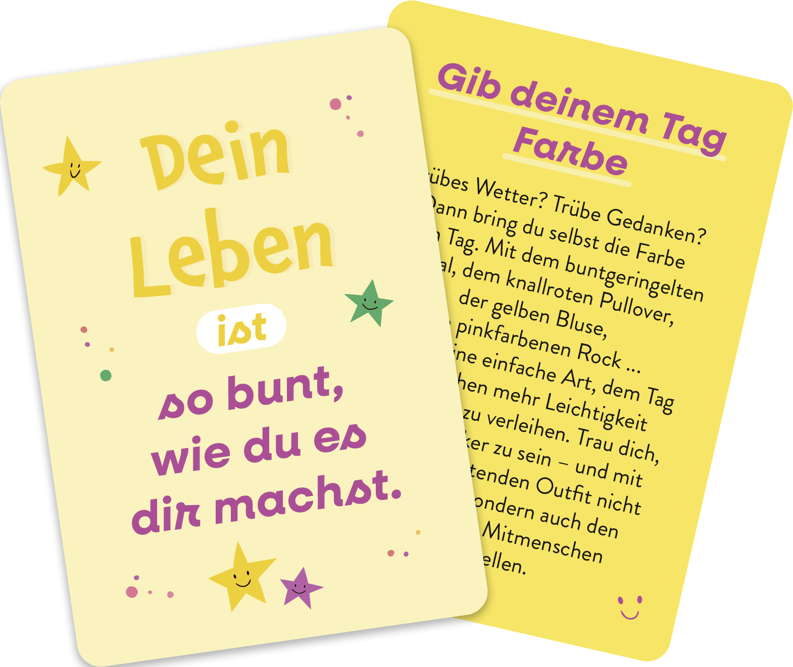 Oder möchtest du einem lieben Menschen einen kleinen Glücksbooster schenken? Egal ob für dich oder für einen Herzensmenschen, egal ob als kleine Aufmunterung oder als Geburtstagsgeschenk, diese 50 Glückskarten machen jeden Tag ein bisschen heller, bunter und glücklicher.