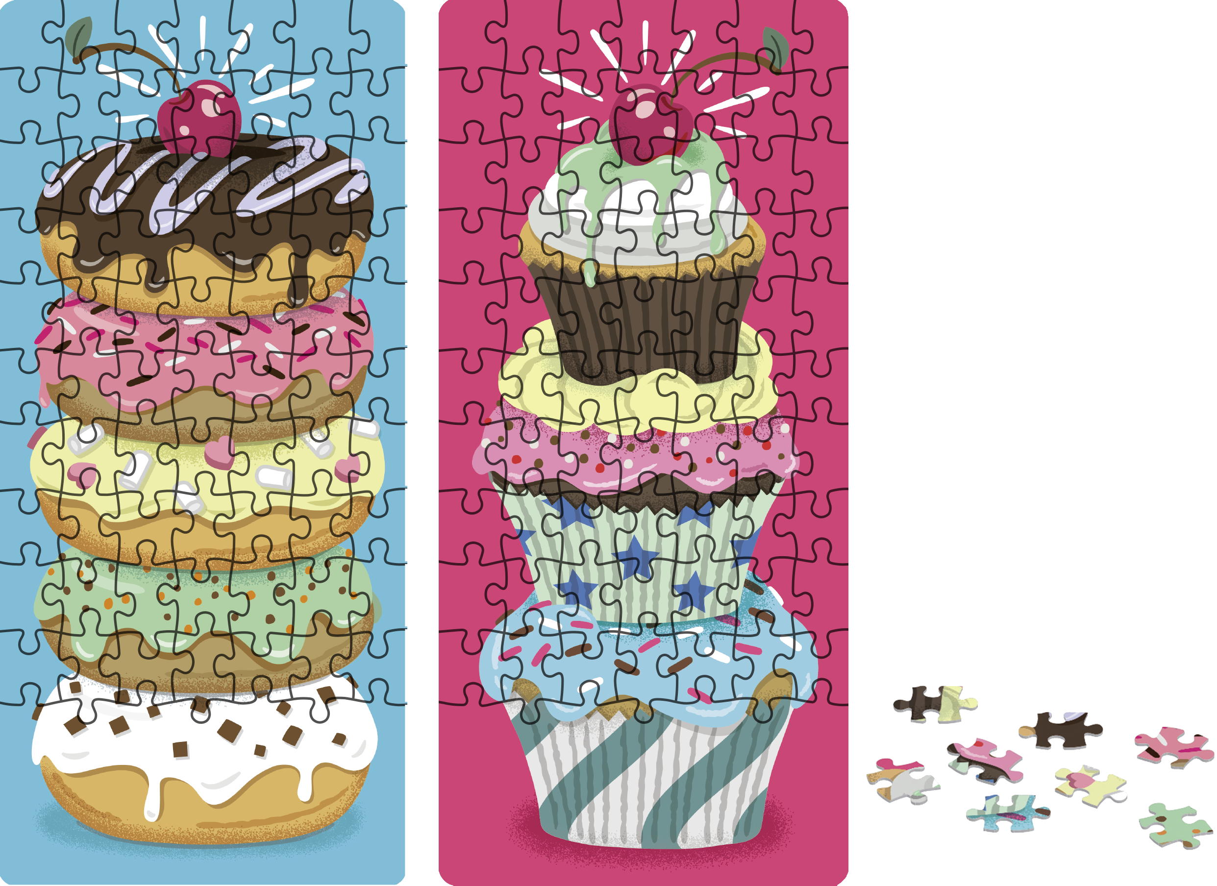 Egal ob du Donuts oder Cupcakes bevorzugst: Dieses Duell wird garantiert kein Zuckerschlecken! Die Schachtel enthält zwei zuckersüße Puzzles à 70 Teile. Wähle eines der beiden Motive aus und gib alles, um dein Puzzle vor deinem Gegner fertigzustellen. Nur wer zuerst alle Teile zusammensetzt, kann sich das finale Teil sichern, das beide brauchen, um ihr Motiv zu vervollständigen. Die fertigen Puzzle sind jeweils ca. 26 x 12 cm groß. Das außergewöhnliches Spielprinzip und die kurze Spieldauer versprechen jede Menge rasanten Puzzlespaß. Ein perfektes Geschenk für alle Puzzlefans, Naschkatzen und Duellspiel-Liebhaber!