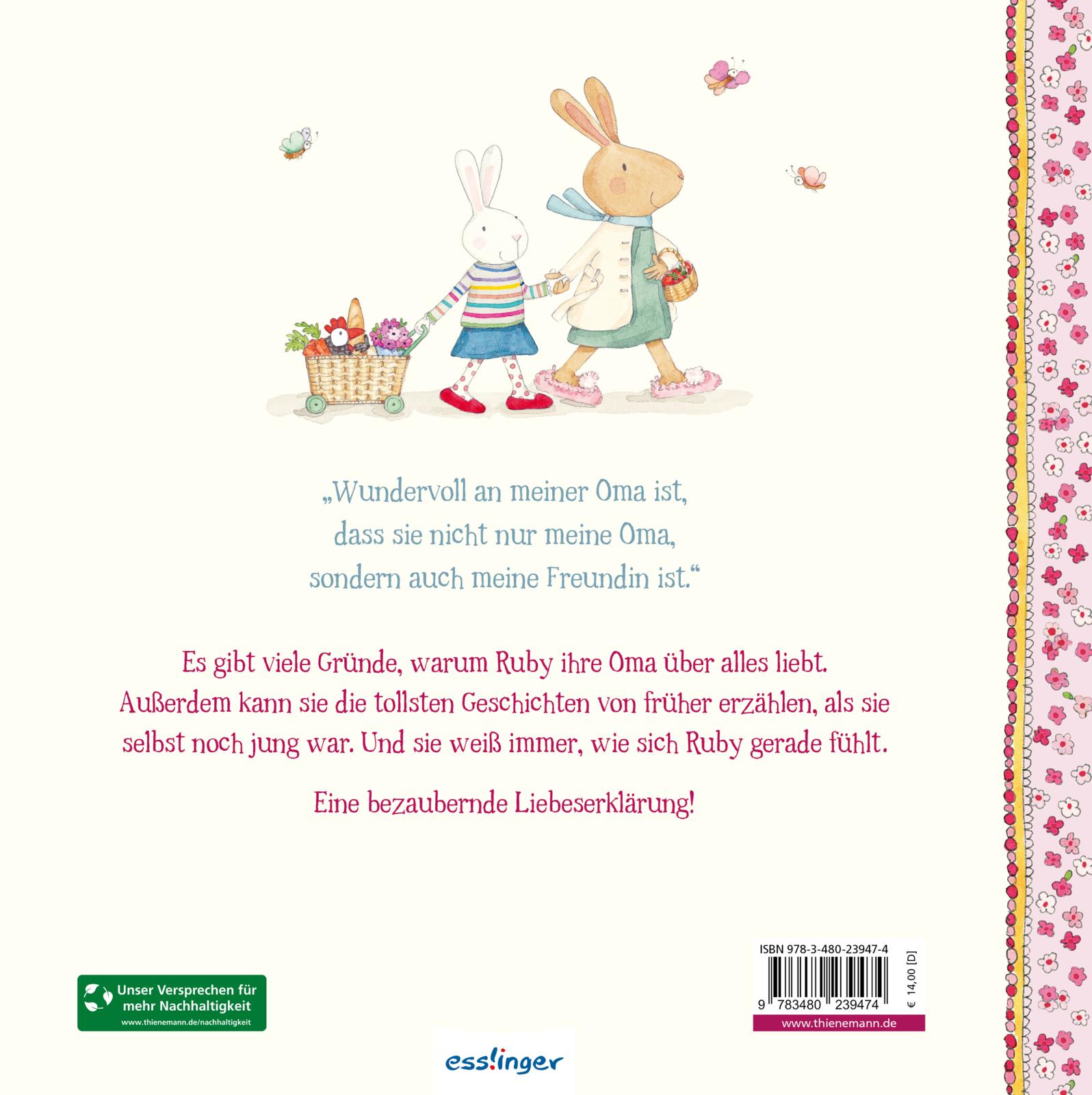 Ruby liebt ihre Oma über alles. Denn sie ist einfach wundervoll. Besonders, wenn sie mit ihren rosa Plüschpantoffeln Einkaufen geht. Außerdem kann sie die besten Geschichten erzählen, zum Beispiel darüber, wie es früher einmal war. Und sie weiß sogar, wo kleine Feen in ihrem Garten wohnen ...