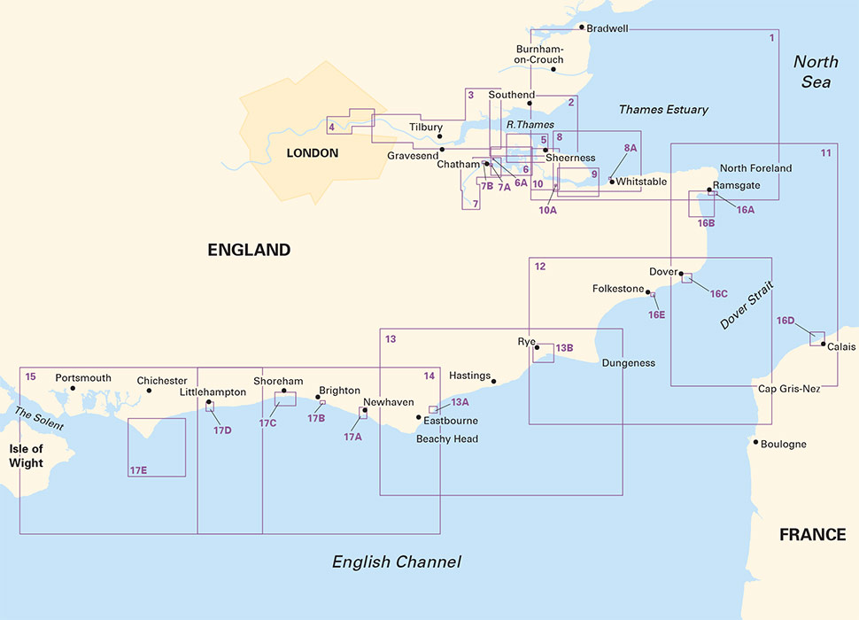 The latest harbour developments at Dover and Calais are also included. The plan of The Looe now provides larger scale coverage. Passage planning sheets are at a uniform scale of 1:120 000 and coverage extends west to the Isle of Wight. Coverage of The Swale has been increased to 1:20 000 and split over two sheets. An additional chart has been added showing large scale coverage of the River Swale approaches from the East and a new harbour plan of Swale Marina has been added. Coverage of the River Medway is now at a scale of 1:20 000 giving twice as much chart detail than previously shown, continuing to Allington Lock. Larger scale coverage of the River Thames from Barking Creek to Tower Bridge is also included. There has been general updating throughout.