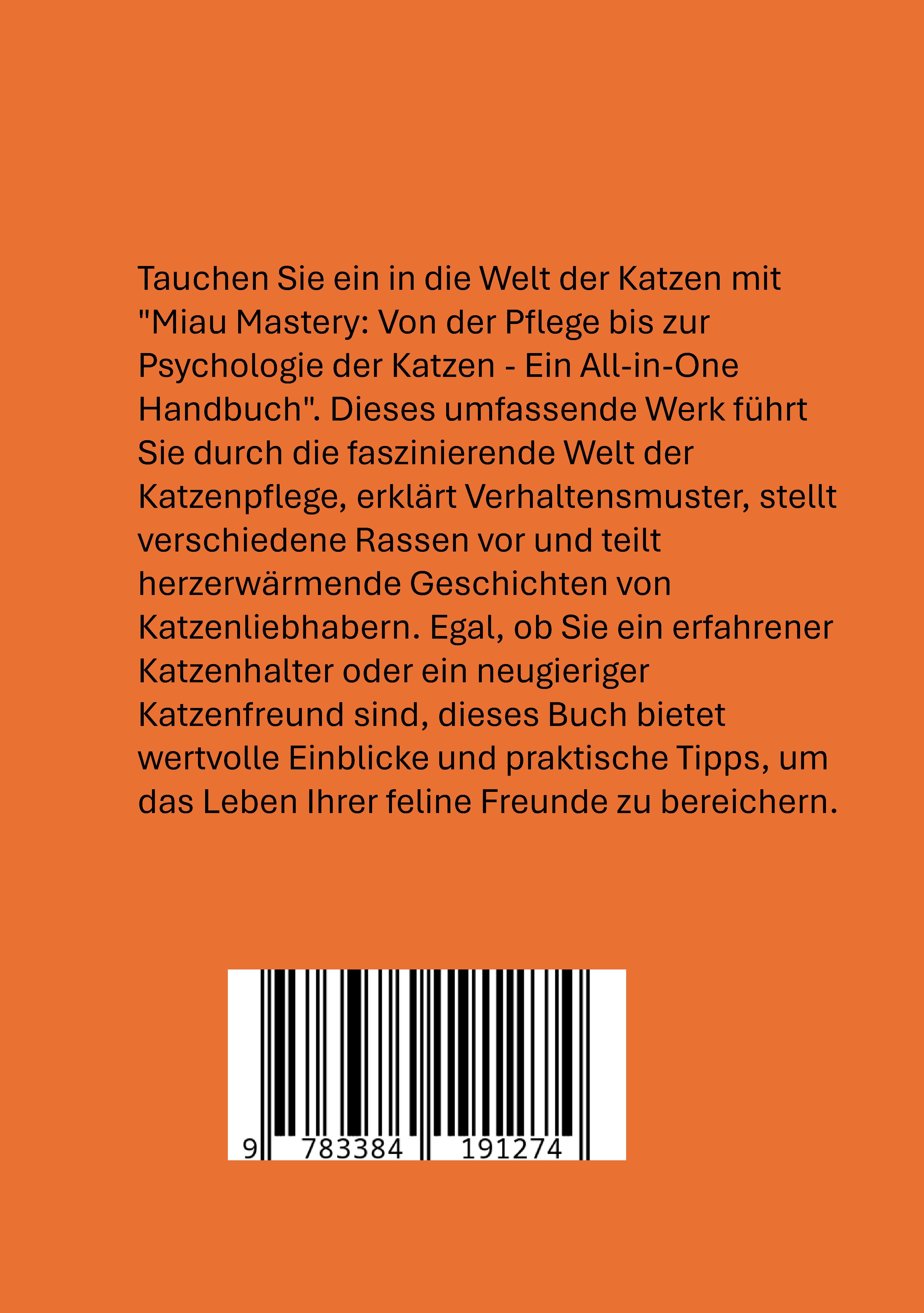 Miau Mastery: Von der Pflege bis zur Psychologie der Katzen. Ein All-in-One Handbuch"Miau Mastery: Von der Pflege bis zur Psychologie der Katzen" ist der ultimative Leitfaden für jeden Katzenliebhaber. Mit Expertenratschlägen, fundierten Informationen und inspirierenden Geschichten ist dieses Buch Ihr Schlüssel zu einem tieferen Verständnis der Katzenwelt. Von der Auswahl der richtigen Katze über die tägliche Pflege bis hin zu detaillierten Profilen verschiedener Rassen bietet dieses Buch alles, was Sie wissen müssen, um eine liebevolle und unterstützende Umgebung für Ihre Katze zu schaffen. Begleitet von emotionalen Anekdoten aus der Katzencommunity, ist "Miau Mastery" mehr als nur ein Pflegehandbuch - es ist eine Hommage an die tiefe Verbindung zwischen Katzen und Menschen.