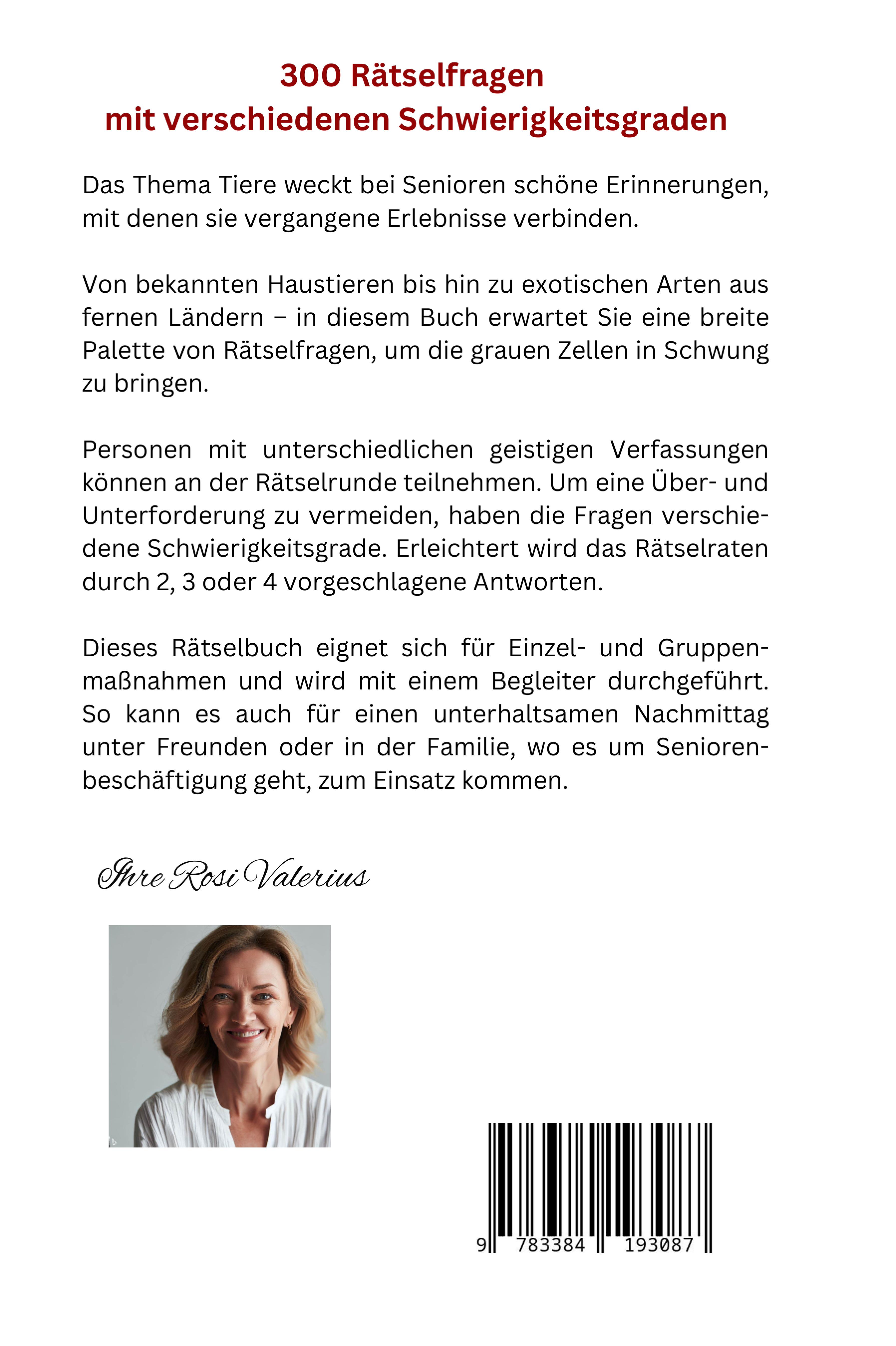 Willkommen in der bunten Rätselwelt der TiereIch freue mich, Ihnen in diesem Buch spannende und herausfordernde Rätsel präsentieren zu dürfen, die speziell auf die Interessen und Bedürfnisse älterer Personen zugeschnitten sind.Tiere begleiten uns seit jeher und haben einen besonderen Platz in unserem Herzen. Sie begeistern uns mit ihrer Vielfalt, ihren erstaunlichen Fähigkeiten und ihrer Schönheit.Von bekannten Haustieren bis hin zu exotischen Arten aus fernen Ländern - es erwartet Sie eine breite Palette von Fragen und Rätseln, um die grauen Zellen in Schwung zu bringen.Dieses Rätselbuch eignet sich für Einzel- und Gruppenmaßnahmen und wird mit einem Begleiter durchgeführt. So kann es auch für einen unterhaltsamen Nachmittag unter Freunden oder in der Familie, wo es um Seniorenbeschäftigung geht, zum Einsatz kommen.Personen mit unterschiedlichen geistigen Verfassungen können an der Rätselrunde teilnehmen. Um eine Über- und Unterforderung zu vermeiden, haben die Fragen verschiedene Schwierigkeitsgrade. Erleichtert wird das Rätselraten durch 2, 3 oder 4 vorgeschlagene Antworten.Das Buch wurde im Praxisalltag in der Seniorenbetreuung entwickelt. Ziel ist es, mit den vielfältigen Rätseln nicht nur Unterhaltung zu bieten, sondern auch die geistigen Fähigkeiten zu fördern und den Wissensschatz zu bereichern. Denn Rätsel lösen ist nicht nur eine angenehme Freizeitbeschäftigung, sondern auch eine wertvolle Übung für Ihr Gedächtnis, Ihre Konzentration und Ihr logisches Denken.Eine Betreuungsperson liest die Frage vor und regt die Rätsel-teilnehmer zum Überlegen an. Wird die Antwort nicht sofort gefunden, werden nach einem Moment des Nachdenkens die Antwortmöglichkeiten vorgelesen. Hierdurch werden viele Rätsel richtig gelöst, was schöne Erfolgserlebnisse ermöglicht und die Motivation hochhält.Ich hoffe, dass das Rätselbuch Ihnen und Ihren Lieben viel Freude bereitet, neue Erkenntnisse vermittelt und schöne Erinnerungen weckt.Also tauchen Sie ein in die Welt der Tiere und genießen Sie die Rätselabenteuer, die vor Ihnen liegen.