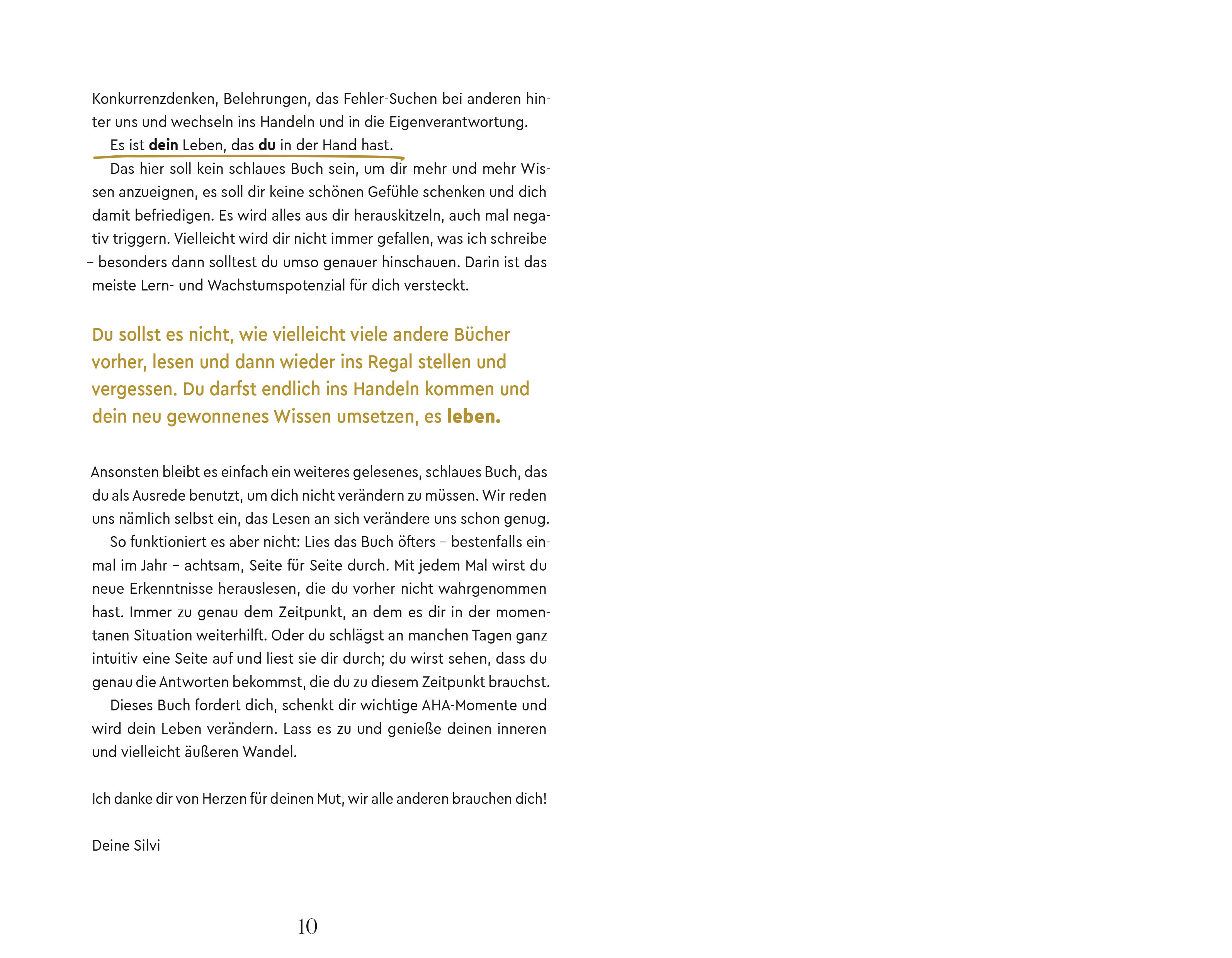 Manchmal fühlen wir Menschen uns in unserem Alltag wie gefangen. Täglich erleben wir dasselbe, essen dasselbe, sagen und denken dasselbe. Die Folge ist eine tiefe Unzufriedenheit, ein unvollständiges Leben, das Gefühl, dass es das noch nicht gewesen sein kann. Ein eintöniges Alltagsrad kann uns langfristig nicht glücklich und zufrieden machen. Das Leben schreit nach Veränderung und wird dadurch erst vollständig und rund. Mit diesem Buch möchte Silvi Lesenden ihre Lebenserfahrungen und Sichtweisen an die Hand geben, um endlich wieder glücklich und zufrieden durchs Leben zu gehen. Egal in welcher Situation man gerade ist, alles kann und wird sich zum Positiven verändern, wenn man bereit ist, ins eigene Innere zu schauen, sich kennenzulernen und die Ratschläge und Anleitungen in diesem Buch umzusetzen. Es ist eine Verwandlung, in der man die Welt neu betrachtet und die Mitmenschen sowie sich selbst auf einer völlig neuen Ebene kennenlernt. Vor allem langfristig entsteht ein unbeschreibliches, erleichterndes, aufblühendes Gefühl!