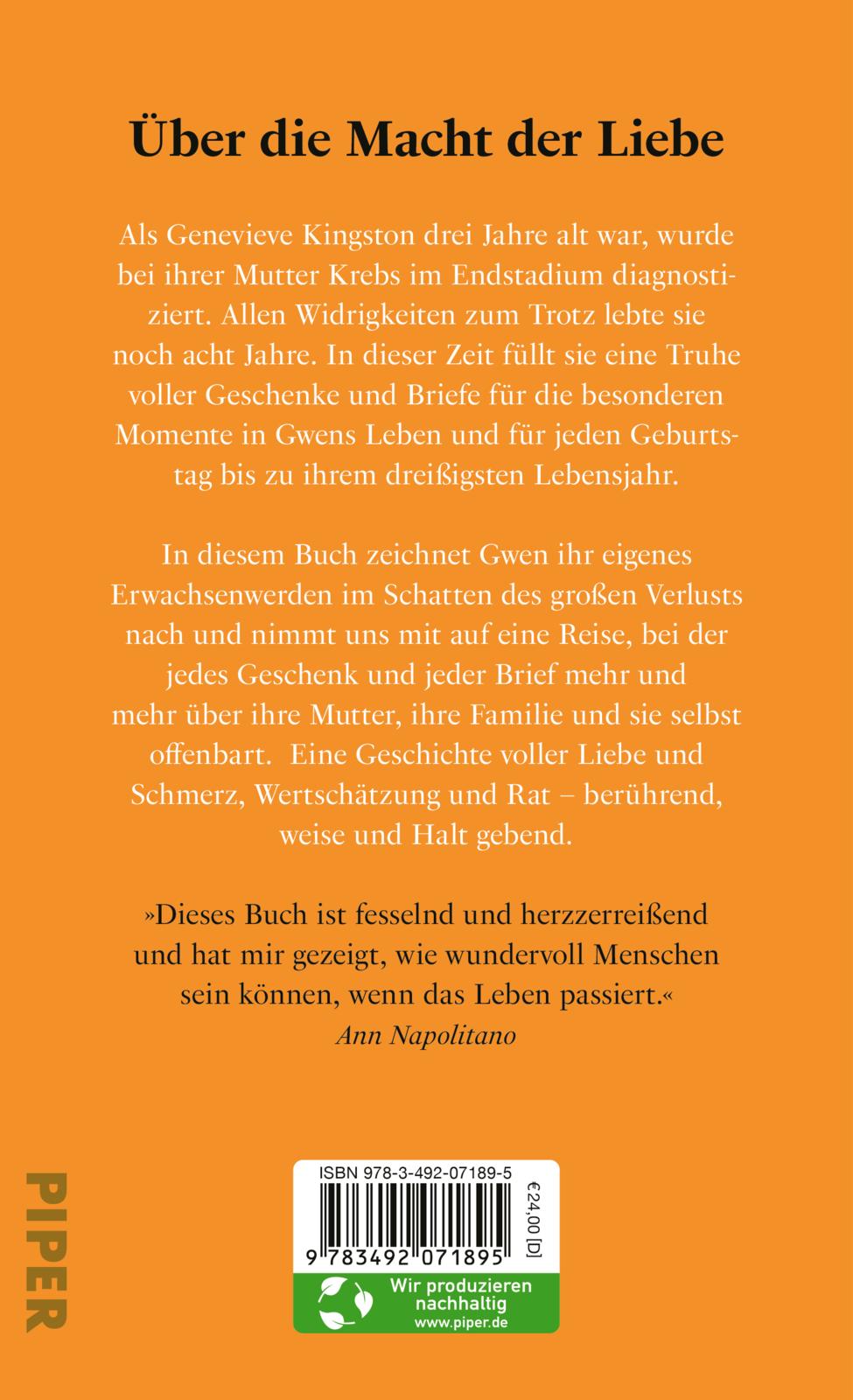 Als Genevieve Kingston drei Jahre alt war, wurde bei ihrer Mutter Krebs im Endstadium diagnostiziert. Allen Widrigkeiten zum Trotz lebte sie noch acht Jahre. In dieser Zeit füllte sie eine Truhe mit Geschenken und Briefen an ihre Tochter zu jedem wichtigen Meilenstein und Geburtstag bis zu ihrem dreißigsten Lebensjahr. Dies ist die unvergleichliche Geschichte einer jungen Frau, die im Schatten großen Verlusts aufwächst, geleitet von dem, was ihre Mutter ihr hinterlassen hat. Eine Geschichte voller Liebe und Schmerz, aber auch voller Wertschätzung und Rat - berührend, weise und Halt gebend.